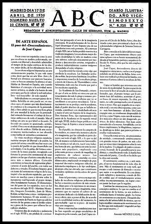 Se puede contestar a esto último que los intereses de la creación contemporánea se dirigen actualmente en sentido muy distinto a los de aquellos tiempos del primer tercio del siglo XX. Pero el mismo artículo del ABC de 1930 nos muestra que no era muy distinta la situación entonces. Fue necesario un revulsivo como el que significó el Descendimiento de Capuz para que la crítica de arte tomara en consideración la imaginería. ¿Dónde está hoy ese revulsivo? A la espera de esa nueva parusía del genio creador en la imaginería, Capuz sigue ejerciendo magisterio desde el elocuente silencio de su obra cada noche de Viernes Santo.