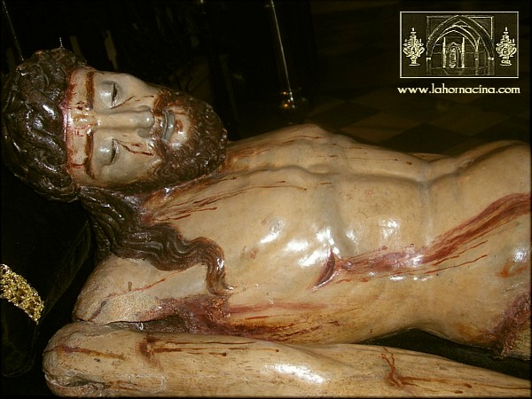 Análisis Artístico La imagen del Santo Cristo Yacente de Gibraltar es una obra que podríamos fechar en la segunda mitad del siglo XV, fecha que coincide con la Reconquista por segunda vez de esta plaza. Se trata de una escultura de madera, que está realizada para que se representase con ella la escena del Descendimiento. Eran comunes las dramatizaciones de la Pasión de Cristo, siendo el referido momento para el que se realizaban este tipo de esculturas, que realmente son crucificados con un gozne en los brazos que los hace móviles, de modo que se pueden sostener en la cruz y bajarlos de la misma en medio de una obra teatral. Aún hoy quedan lugares en Andalucía como Trebujena (Cádiz), Cartaya (Huelva) o Alcalá del Río (Sevilla) en los que se lleva a cabo este drama, por lo que suponemos que en Gibraltar se realizaría también. Tenía lugar el Viernes Santo: el sacerdote predicaba un sermón alusivo a la muerte de Jesús, mientras que los cofrades de la hermandad solían hacer el papel de Santos Varones, desclavando la imagen de la cruz, descendiéndola, amortajándola, y depositándola en la urna. Al término de la ceremonia comenzaba la procesión del Santo Entierro (2). Los personajes estaban interpretados exclusivamente por hombres; siendo varones adolescentes los que se encargaban de los roles femeninos: por ejemplo, en el Libro de Cuentas de la Catedral de Sevilla se habla del “mozo que hacía de María”. Podían además estar caracterizados con máscaras que representaban a los personajes, como seguimos viendo en la actualidad en las celebraciones de la Semana Santa de las localidades cordobesas de Puente Genil y Peñaflor (3). Las primeras noticias de estas representaciones en el Reino de Castilla son las de la Catedral de Zamora, a fines del siglo XIII (4). Lógicamente, con la Reconquista se fueron expandiendo por el resto de los Reinos de España, realizándose ya en Andalucía en 1454 en la Catedral de Sevilla (5). El Cristo presenta una musculatura esquemática, realizada con poco detallismo, cubriendo su desnudez con un paño de pureza corto, blanco, con el filo dorado, anudado en la cadera izquierda. La moña aparece desmochada debido a la costumbre de sobrevestir a las imágenes, que no solo afectó a las vírgenes sino también a los Cristos yacentes y crucificados, a los que se le colocaban ricos sudarios de telas bordadas en metales preciosos y se les amortajaba con este mismo tipo de tejidos (6), apareciendo la escultura totalmente cubierta y asomando sólo la cabeza. Aún hoy la imagen gibraltareña, durante su durante su procesión del Sábado Santo, se sigue presentando a los fieles amortajada con un paño de encaje que deja translucir su anatomía. Al estar concebido para ser crucificado, el movimiento de la escultura sigue el propio de esta iconografía, presentando una caída de las piernas ante el peso del cuerpo ya muerto hacia el lado derecho, y este mismo pie sobre el izquierdo. Los brazos, como ya hemos comentado, finalizan en forma de bolas, que encajan en una cavidad situada en las axilas del Cristo, por lo cual, al estar crucificado es cuando realmente se aprecia la proporción de la escultura. Las manos, por su parte se encuentran en actitud de bendecir. El rostro presenta una expresión triste. Su cabeza cae hacia el lado izquierdo. Los ojos y la boca se encuentran entreabiertos, dando así mayor dramatismo a la faz. De ellos salen regueros de sangre que surcan la cara, cuyos pómulos aparecen hinchados. El tratamiento de la barba es a base de sencillos bucles, así como el cabello, muy esquemático, cayendo un mechón ondulado por el lado izquierdo del cuello y el resto por la espalda. La corona de espinas, tallada sobre el mismo bloque de la cabeza, presenta la forma de 8 típica de finales del siglo XV, como podemos observar en otras imágenes de la misma época, tanto en pintura como en escultura. Recientemente fue restaurado por María Eugenia Sánchez Corchete, que limpió y consolidó la escultura. |