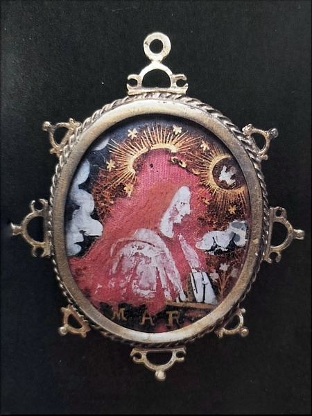 El Concilio de Trento supuso un fuerte respaldo a la invocación y veneración, tanto de las imágenes como de las reliquias de la Virgen María y de los santos, algo que se vendría dando desde los inicios del Cristianismo. Esto surgiría como respuesta al repudio que de ellas hacían los protestantes basando sus alegatos en el fomento de la idolatría. Desde este tiempo sería próspero el mercado de reliquias por el mundo cristiano hasta el punto de producirse un tráfico ilegal alentado por las falsificaciones que terminarían surgiendo. La situación se acentuó debido a la fuerte expansión postridentina de las órdenes religiosas y a la mentalidad maravillosista del Barroco. A partir de ahora, además de las reliquias custodiadas en las catedrales, las iglesias y los conventos, aparecerían otras de minúsculo formato para las que se fabricarían expresamente pequeños relicarios-joya encargadas para las devociones particulares. Estos colgantes cubrirían la necesidad de los fieles de poseer, venerar y mantener cerca de sí fragmentos de reliquias con una finalidad protectora. Con todo, la posesión de reliquias verdaderas, (o "vestigia") no estuvo al alcance de todo el mundo. Por esta razón proliferaron una serie de medallones devocionales parecidos a los relicarios, donde la reliquia sería sustituida por la imagen de la Virgen o de Cristo. Predominaron los de forma oval, normalmente hechos de plata o plata sobredorada, con ventanas. Solían tener dos vidrieras de cuarzo hialino, una por cada cara, que permitían ver su contenido, siendo algunos de ellos abrideros. Se remataban en su parte más alta por un asa o argolla, para poder colgarlos de una cadena. Bajo las ventanas de cristal, a veces biselado, se situaban las reliquias o figuras de bulto sobre un forrado de telas ricas. El conjunto interior se adornaba a veces con delicadas labores conventuales de papelillo y flores secas, con hilos metálicos, lentejuelas y cartones recortados en miniatura. Realmente, los relicarios y medallones serían bastante frecuentes y muchos pasaron a la indumentaria de las imágenes de la Virgen de una manera natural. La colocación a veces era algo caótica, por la cantidad de ellos que se le prendían a la imagen. Normalmente eran fijados o cosidos a los revestimientos textiles de la talla, añadiéndoles un lazo de tela o pasamanería como remate. Pero otras veces la cantidad de ejemplares era tal que se colgaban de unas cadenas colocadas normalmente en horizontal, a modo de guirnaldas. En aquellas ristras era habitual ver también otro tipo de piezas que nada tenían que ver con el carácter devocional de los medallones, tales como higas, cascabeles, ramas de coral o amuletos de todo tipo, con un marcado carácter protector. |