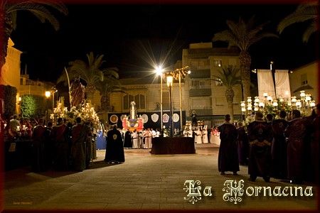 El acto se inicia al anochecer, entre las 20:30 y las 21:00 horas, dependiendo de que la Semana Santa caiga en el mes de Marzo o en el de Abril. Empieza con la entrada en la plaza de la libertad de la Cofradía de Nuestra Señora de los Dolores: el estandarte negro bordado en plata y seda antecede a las filas de nazarenos. Portan faroles de fundición iluminados con cera líquida tras tulipas que llevan grabado el anagrama de la cofradía. Preside la soberbia imagen de la Virgen de los Dolores ataviada de Soledad: delantero blanco con hilo de plata y manto negro bordado en plata por los talleres de Ángel Pinar de la Ribera de Molina de Segura (Murcia) en el año 1948. Entra en la plaza a los sones de la banda de música de la Asociación de Amigos de la Música de Lorquí. La Cofradía se sitúa en el lado derecho de la Plaza de la Libertad. Le sigue la Cofradía de San Juan Evangelista que hace su aparición acompañada de su propia banda de tambores y cornetas. Abre su cortejo el estandarte negro, bordado en oro, que estrenó en 2004. Tras el mismo, las filas de penitentes con túnica verde, capa, capirote y cíngulos granates; zapatos y guantes negros. La imagen de San Juan Evangelista, que tallara en el año 2002 el escultor e imaginero murciano Francisco Liza Alarcón, finaliza el cortejo de su Cofradía. Ocupa su lugar correspondiente en el lado izquierdo de la plaza de la libertad. En tercer lugar hace su entrada la Cofradía de Cristo Resucitado que en esta noche procesiona la imagen de Santa María Magdalena. Le sigue su propia banda de tambores y cornetas. La Cofradía del Santísimo Cristo del Perdón es la cuarta en llegar a la plaza de la libertad. Estandarte y penitentes a los que sigue el trono vacío ocupan el lugar designado al pie del estrado. Su banda de tambores les acompaña. Termina esta primera parte del acto con la llegada de la Cofradía de Nuestro Padre Jesús Nazareno. Morados penitentes con faroles de la misma factura que los de las cofradías restantes anteceden al trono de la Cruz Vacía con sudario. A los sones de sus tambores entran y ocupan su lugar correspondiente. |