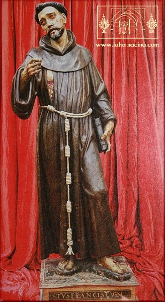 La escultura, representada con el tradicional sayal franciscano de color marrón, ceñido a la cintura con un cordón de varios nudos, se descompone en planos y finos pliegues de estupenda factura, los cuales se agrandan y prolongan verticalmente hasta la altura de los tobillos, dejando al descubierto los huesudos y descalzos pies, en los que es posible observar, además del excelente modelado anatómico, un detalle muy mesino como es el de representar el dedo segundo del pie mucho mas largo que el primero; característica presente, por ejemplo, en la mayoría de sus Cristos Crucificados.