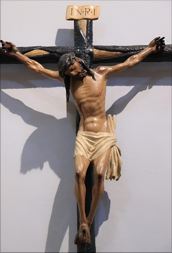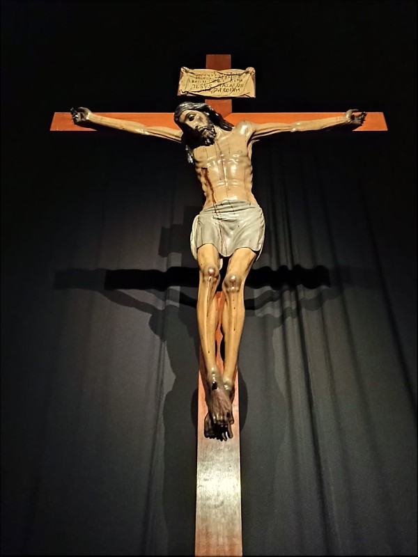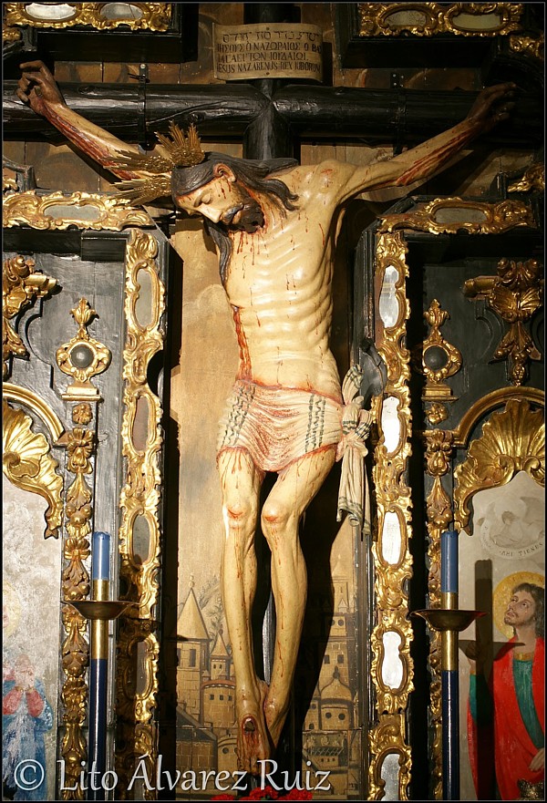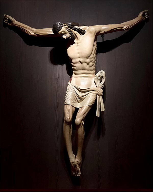 La posición de las piernas flexionadas y con un leve desvío hacia nuestra izquierda es común en los cinco casos que traemos en este estudio. El perizoma de nuestro crucificado tiene la misma resolución que en las cuatro comparativas: muy ajustado en las caderas y muslos, corto y con una lazada similar en los cinco casos. El crucificado de Castilleja ha perdido la parte alta de dicha lazada pero se percibe su forma, además es común también en todos ellos la forma de rematar el resto de tela sobrante para que caiga recto por su propio peso. El cuerpo en todos los casos es de señalada musculatura y amplio tórax, llegando casi a tocar la espalda con la propia Cruz, prominente de pecho y en todos los casos de estrecha cintura. La cabeza de los cuatro crucificados que estamos presentando en su comparación suelen tener el rostro alargado y anguloso, nariz amplia y recta y una muy marcada caída hacia su derecha. El crucificado de Castilleja difiere precisamente en la testa; su rostro no es tan alargado y presenta, además, corona de espinas trenzada, con lo cual la zona craneal se observa más ancha y da aún más la sensación de rostro triangular en vez de alargado. Ese detalle hace que recuerde a simple vista los crucificados de Jorge Fernández, de los que un servidor ha atribuido a dicho escultor varias obras que fueron publicadas en su momento; pero si nos fijamos bien, solamente es ese detalle, ya que la corona de espina tiene forma estilística distinta y el tratamiento de bigote barba y cabello no corresponde con los realizados por Fernández, artista de origen alemán. Las piernas de los crucificados de Fernández son también de un tratamiento distinto, proporcionalmente más cortas con respecto al cuerpo y aún más delgadas. El perizoma es radicalmente distinto; es corto pero no ajustado y nunca presenta nudo o lazada, la que lleva el crucificado de la Amargura de Carmona es posterior, la realizó el escultor Francisco Buiza ya en el siglo XX. El cuerpo que realiza el escultor alemán en sus obras es muy delgado y enjuto, el tórax es muy estrecho, poco trabajado al igual que la espalda. Por todo lo anterior, ¿realizaría la obra de Castilleja de la Cuesta el escultor Francisco de Ortiz de Vargas? Según mi criterio no sería descartable, pero sería más prudente dejarla como imagen perteneciente a la escuela de Pedro de Gante ya que todos los rasgos estilísticos citados concuerdan con los cuatro crucificados de Ortiz de Vargas. Pero esas cuatro tallas muestran, según mi criterio, un parecido más apreciable en sus rostros que el de Castilleja, aunque sin duda presenta más similitudes formales que las realizadas por el escultor Jorge Fernández. |