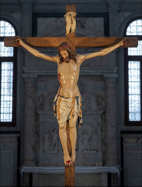 Esta imagen de Cristo crucificado era utilizada cada Viernes Santo para recrear la expiración de Jesús en la cruz. Con el fin de llevar a cabo esta función litúrgica tan inusual, disponía de una cuerda que era utilizada para mover la lengua, hoy perdida, y una cavidad en su cabeza que permitía que saliera humo de su boca, un efecto especial con el que se pretendía dramatizar el último aliento del redentor. La talla pertenece al templo veneciano de San Francesco della Vigna. Desde mediados del siglo XIX estaba olvidada en uno de los corredores de las dependencias conventuales construidas para los terciarios franciscanos, concretamente en un pasillo del primer piso inaccesible para el público, hasta que una reciente restauración patrocinada por Save Venice, la institución estadounidense que desde 1971 financia rehabilitaciones de obras de arte en Venecia, ha puesto de nuevo en valor todos sus méritos artísticos y religiosos. El crucificado fue esculpido en madera de arce y policromado en temple de altísima calidad. Se cree que data de principios del siglo XV, en torno al periodo comprendido entre 1390 y 1420, y que recibía culto en la iglesia primitiva gótica del siglo XIII dedicada a San Francisco de Asís, cuyas reducidas dimensiones y precario estado de conservación hicieron que fuese reconstruida en el siglo XVI por Jacopo Sansovino, si bien la fachada se debe a Andrea Palladio. La sucesiva reconstrucción de Sansovino y Palladio se realizó bajo un impecable diseño renacentista que hace de este edificio una de las joyas del estilo en Venecia. Las fuentes documentales mencionan la presencia de este crucificado en el claustro del cenobio, desde donde fue trasladado a varias capillas laterales de la iglesia y luego, como hemos dicho, a un pasillo del convento. Las leyendas sobre sus habilidades milagrosas atrajeron a multitud de devotos, muchos de ellos del género femenino, que incluso se arriesgaban a la excomunión al entrar en el convento a encomendarse al "Cristo parlante" incluso en la época en la que se veneraba en el claustro de los frailes, vetado a las mujeres hasta el siglo XVII, cuando debido a esa gran devoción se emitió una autorización especial para que pudieran visitarlo. |