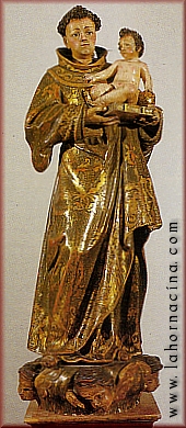 Nacido en Lisboa (1196) como Fernando de Bulloes y Taveira de Azevedo, el popularmente llamado Taumaturgo de Padua por sus numerosos milagros es, en palabras del sacerdote Luis Ribera, el santo popular por excelencia, el santo que obra cosas maravillosas, el de los pobres y el de todo el mundo, tal y como también señalara León XIII al ser venerado en todos los rincones del orbe cristiano. Famoso por sus predicaciones, Pío XII lo elevó en el año 1946 a la categoría de Doctor de la Iglesia. Murió en el año 1231, en Padua (Italia), ciudad por cuyo nombre es universalmente conocido y en la que se conservan sus reliquias. En sus representaciones artísticas, San Antonio de Padua viste el hábito franciscano y se halla representado como un joven esbelto y de extraordinaria belleza, lo que se debe a su juventud durante el ejercicio del apostolado y a su función de santo casamentero, cuyo atractivo incita a los solteros a encomendarse a él para pedirle pareja a su imagen y semejanza. Suele mirar con amor al Divino Infante, al cual sostiene sobre el brazo izquierdo o entre ambas manos, o bien fijamente al espectador. Sus atributos son los lirios y un libro, símbolos de pureza y elocuencia, respectivamente. La obra que aparece en la imagen constituye uno de los más felices simulacros del santo en la escuela sevillana. Fue labrada por el célebre imaginero cordobés Juan de Mesa y Velasco en el año 1620, según se desprende de un contrato firmado el 7 de enero de dicho año entre el escultor y Francisco de Quintanilla. Mide 106 cm y la policromía corresponde al pintor Juan de Uceda Castroverde, colaborador de Mesa en numerosas ocasiones. La efigie es titular del convento sevillano de San Antonio de Padua. Su plástica responde a los postulados del protobarroco sevillano, presentando rasgos estilísticos propios de este periodo. La peana con cabezas de ángeles, que no se corresponde con la talla original, se atribuye al taller de Pedro Roldán (hacia 1660-1670). El libro y el cordón de plata parecen datar de una alteración sufrida en el siglo XVIII. Por último, entre los años 1933 y 1938, fue restaurada por Manuel Cerquera Becerra, quien selló grietas y labró nuevas manos. |