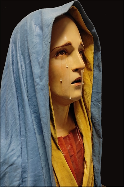El escultor e imaginero zaragozano Víctor Carazo ha realizado una réplica de un busto de la Virgen Dolorosa atribuido al círculo del maestro barroco granadino Pedro de Mena (Granada, 1628 - Málaga, 1688). El busto original se encontraba en el desaparecido convento franciscano de Nuestra Señora de Altabás del Arrabal de Zaragoza, situado en la margen izquierda del río Ebro. Dicho convento fue dinamitado junto con su iglesia por las tropas napoleónicas al abandonar la ciudad, tras los Sitios o asedios sufridos por la capital aragonesa en el año 1808 durante la Guerra de la Independencia. La obra de Pedro de Mena debió sobrevivir a las cargas, dado el testimonio gráfico que existe de la misma, siendo destruida durante la Guerra Civil en el nuevo templo neoclásico de Altabás, construido a finales del siglo XIX según un proyecto del arquitecto José de Yarza para reemplazar al destruido. El busto de Carazo mide 60 cm y está realizado en terracota y telas encoladas, estucadas y policromadas al óleo, siguiendo los procedimientos de la talla original. Cuenta con pestañas de pelo natural y lágrimas de cristal. |
