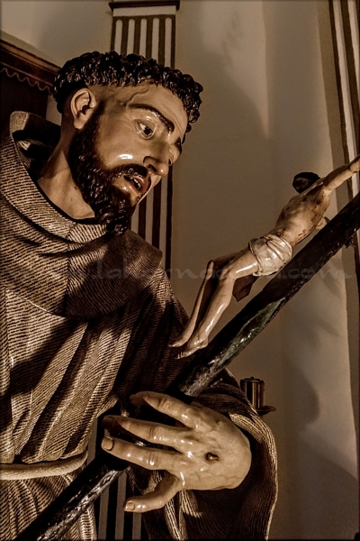 San Francisco de Asís Como muchas otras obras de Luis Salvador Carmona ha estado atribuida a la escuela granadina. No fue hasta 1974 cuando Martín Recio la relacionó con la producción del escultor. Además este investigador localizó en el archivo del convento de San Francisco la fecha de realización de la obra: en las actas de los años 1743 y 1746 se registran una serie de gastos para la adquisición de la imagen y la construcción de su retablo. Una parte importante de la obra fue sufragada por don Juan Bautista Centurión de Ayala, séptimo marqués de Estepa, ministro y benefactor de la Orden Tercera Franciscana de Estepa. Este aristócrata residía en la capital madrileña por lo que pudo conocer al escultor castellano, también vinculado a la misma orden en Madrid. Esta relación explicaría la presencia en Estepa de una serie de obras del citado artista. La imagen se encuentra colocada en un camarín con retablo barroco situado en el muro de la Epístola y no se tienen noticias de cambios de ubicación. Representa al santo con el hábito de la orden, ajustado a la cintura por un cordón de seda con tres nudos que aluden a los votos de pobreza, castidad y obediencia. Otro de los símbolos es el Crucifijo que lleva en su mano izquierda y los estigmas de las manos, los pies y el costado que están siempre a la vista. La herida del costado es visible por una hendidura en el hábito. Posiblemente es la mejor obra de Luis Salvador Carmona de entre las conservadas dentro del Conjunto Patrimonial del Cerro de San Cristóbal. La composición refleja un gran dinamismo. Se representan con gran realismo en la imagen los detalles anatómicos, tanto de las manos como del rostro donde se marcan las arrugas de los ojos, de la frente o las venas de la sien derecha del santo. El crucifijo refleja también gran calidad en su ejecución con una cuidada representación de la anatomía. La imagen de Estepa, que conserva su policromía original y prácticamente sin modificaciones sus características morfológicas originales, muestra gran semejanza con el San Francisco venerado en Olite (Navarra), tanto en la composición como en otros detalles, por ejemplo el crucifijo o las facciones del rostro del santo. |