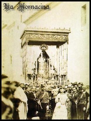 A la izquierda, antigua instantánea del paso de palio de la Hermandad de Montserrat (Sevilla), cuya dolorosa montañesina quedó afectada en su policromía a causa de un incendio ocurrido en el año 1899, que prendió fuego al manto procesional a la entrada del cortejo penitencial en la calle Murillo, teniendo la imagen que ser restaurada ese mismo año por el escultor e imaginero Manuel Gutiérrez Reyes, hermano de la cofradía. Por último, a la derecha, primer plano de la Virgen de la Paz (inmortalizado por el fotógrafo Juan Carlos Gallardo Ruiz) de la Cofradía de Olivareros de Utrera (Sevilla), cuyas mascarilla y manos resultaron dañadas en el año 2006 como consecuencia de un incendio fortuito declarado en su parroquia. Es una de las primeras obras del sevillano Manuel Ramos Corona (1985), muy influida aún por la estética de su maestro Álvarez Duarte. |