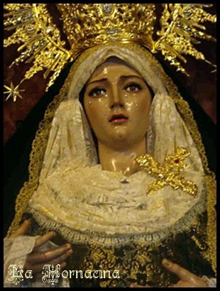 A la izquierda, la Virgen del Mayor Dolor, de la Cofradía del Calvario de Córdoba, una interesante imagen tallada en 1945 por Francisco Díaz Jiménez y Antonio Castillo Ariza (tomando como modelo la espléndida titular mariana de la Hermandad de Jesús Nazareno), que resultó dañada por un incendio fortuito en 1995, teniendo el artista cordobés Miguel Ángel González Jurado que restaurar su encarnadura y realizarle nuevas manos. A la derecha, la Virgen del Valle de Sevilla antes del incendio que, en 1909, se desencadenó en su altar de la Iglesia del Santo Ángel, templo en el que la cofradía se hallaba establecida por esas fechas. La restauración que el Instituto Andaluz del Patrimonio Histórico (IAPH) acometió en 2007 reveló que, bajo capas de yeso y policromía que incluyen sus famosos ojos de tonos verdosos, la dolorosa conservaba más impronta original mesina de la que se pensaba, pese a la profunda remodelación efectuada por el imaginero José Ordóñez a raíz del lamentable incidente. |