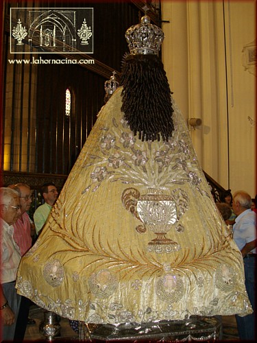 Durante los pasados dieciséis primeros días de septiembre se ha celebrado la Festividad de Nuestra Señora de la Fuensanta, Patrona Principal de la Ciudad de Murcia y su Huerta. Con tal motivo y durante la estancia de la Patrona en su Catedral, su Camarera, Pilar de la Cierva Kirpatrick, la vistió con un valiosísimo traje de gala, diseñado por el modisto Charles Frederick Worth, y ofrendado a la Virgen en 1912 por la Marquesa de la Laguna. Dicho traje, debido a su gran peso y delicadeza de materiales, se encontraba imposibilitado de ser colocado sobre el miriñaque de la imagen y, después de cincuenta años sin utilizarse, ha sido restaurado y puesto en uso de nuevo por iniciativa de su actual Camarera. |