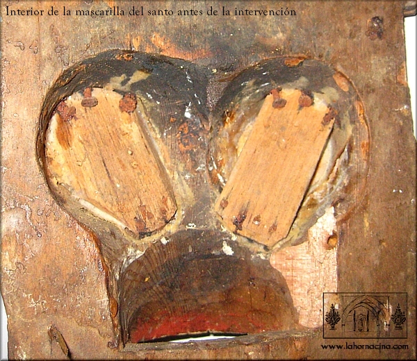 Para ello, su actual propietario encargó el pasado año 2010 la restauración del busto a Jesús Guerrero García, restaurador y conservador de obras de arte en Sanlúcar de Barrameda (Cádiz), quien ha intervenido sobre la misma devolviéndolo al estado que presenta en la actualidad, sometiéndola a un tratamiento de gases inertes para frenar el ataque de insectos xilófagos, a la vez que se le han resanado la madera que conforma su soporte material. La falta de cohesión de la mascarilla ha posibilitado su separación del resto de la cabeza y el acceso al interior, donde se comprueba cómo, en una intervención anterior, se reponen los antiguos ojos de cascarilla por unas piezas de madera muy mediocremente policromadas. La metodología estructural planteada por Guerrero García ha partido de reconstruir toda la zona del busto y recrear la embocadura y capucha del hábito del santo franciscano con pasta de madera, a la vez que se han repuesto los globos oculares, en este caso de cristal. Finalmente, la recuperación cromática de la imagen es totalmente nueva. Las carnaciones están policromadas al óleo y los ropajes estofados al temple sobre oro. Como paso previo, ha sido estucado con preparación magra tradicional de sulfato cálcico y cola de origen animal. |