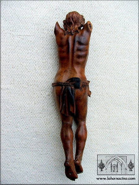 La imagen es de madera de boj, y según su restaurador puede ser obra de un autor acostumbrado a tallar Crucificados en marfil. Como hemos apuntado, detalle que confirma personalmente su propietario, recuerda a las obras del barroco dinámico que se impusieron en la capital hispalense a partir de la segunda mitad del siglo XVII de la mano del artista flamenco José de Arce, seguidas muy de cerca y popularizadas por el sevillano Pedro Roldán y su escuela. |
