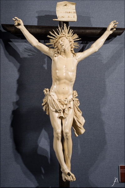 La obra está catalogada en la muestra como hispano-filipina, aunque más parece italiana su procedencia y del siglo XVII; de hecho, es un buen ejemplo de la sofisticación que alcanzó la eboraria en Italia desde su difusión a partir de la segunda mitad del siglo XVI. Artistas del país tallaban los colmillos de los elefantes que llegaban a Europa del norte de África por barcos que arribaban en puertos como el de Venecia, Génova o Nápoles. |
