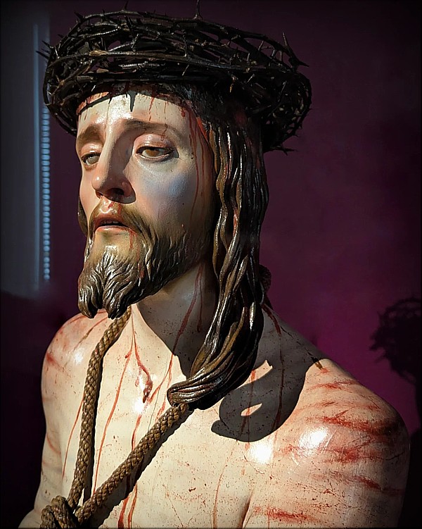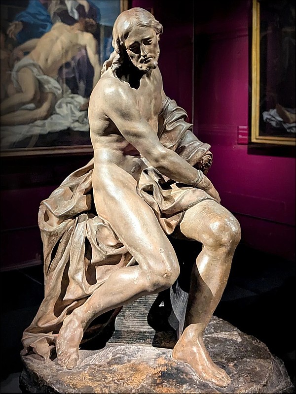 Pedro de Mena La presencia española en la exposición se manifiesta ejemplarmente en obras maestras como el retrato del papa Inocencio X (hacia 1650) de Diego Velázquez, el Cristo muerto sostenido por un ángel (hacia 1646-1652) de Alonso Cano o este Ecce Homo (1673), talla policromada de Pedro de Mena que se conserva en el Museo Nacional de Artes Decorativas (Madrid). |