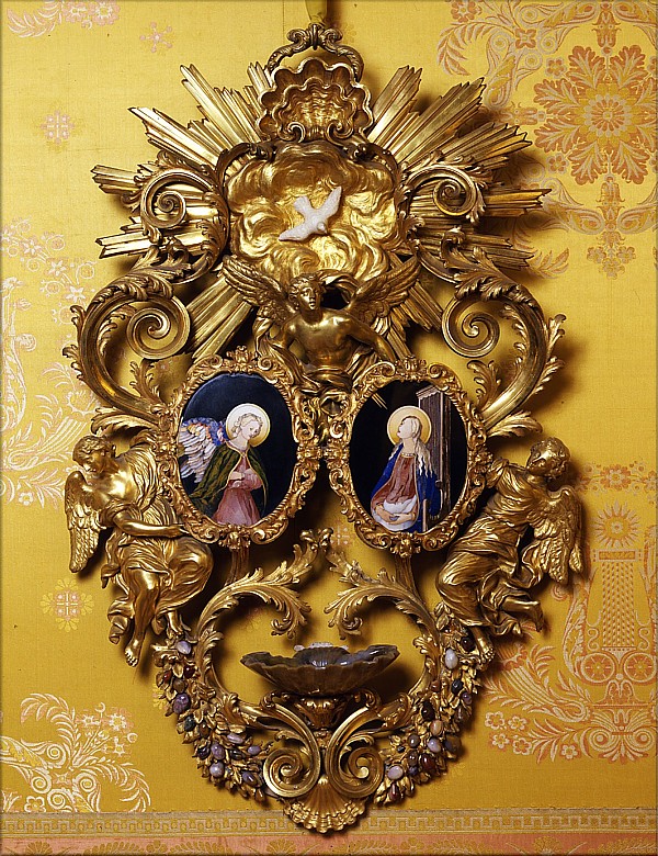 Giovan Battista Foggini Esta suntuosa pila bautismal (1704) de bronce dorado, diseñada por Foggini para la devoción particular, formaba parte de una colección de obras maestras elaboradas con un amplio uso de piedras semipreciosas, que fueron enviadas a la ciudad alemana de Düsseldorf como regalo de Cosimo III de Médici a su hija Anna Maria Luisa, quien se había casado con Juan Guillermo de Neuburgo, el príncipe elector del condado Palatino del Rin. Finalmente, fueron devueltas al Palacio Pitti con su séquito en 1717, cuando la princesa Médici, ya viuda, regresó a Florencia. |