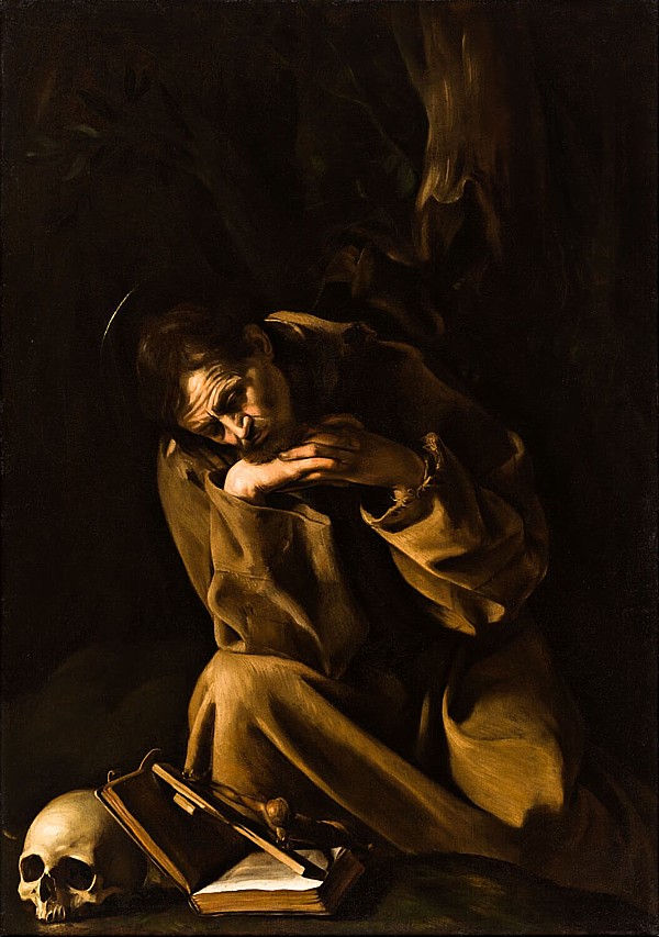 Caravaggio La sección "Visiones místicas. El espíritu, la carne, el éxtasis" de la exposición explora la experiencia del éxtasis en la pintura barroca, a la luz de la espiritualidad de la Contrarreforma. La conexión entre santos y divinidad se traduce en imágenes de gran interacción emocional y física. El San Francisco en meditación (hacia 1606) de Caravaggio (Pinacoteca Ala Ponzone de Cremona) traduce la experiencia mística en una meditación silenciosa y concreta, jugando con los contrastes de luz y sombra. |