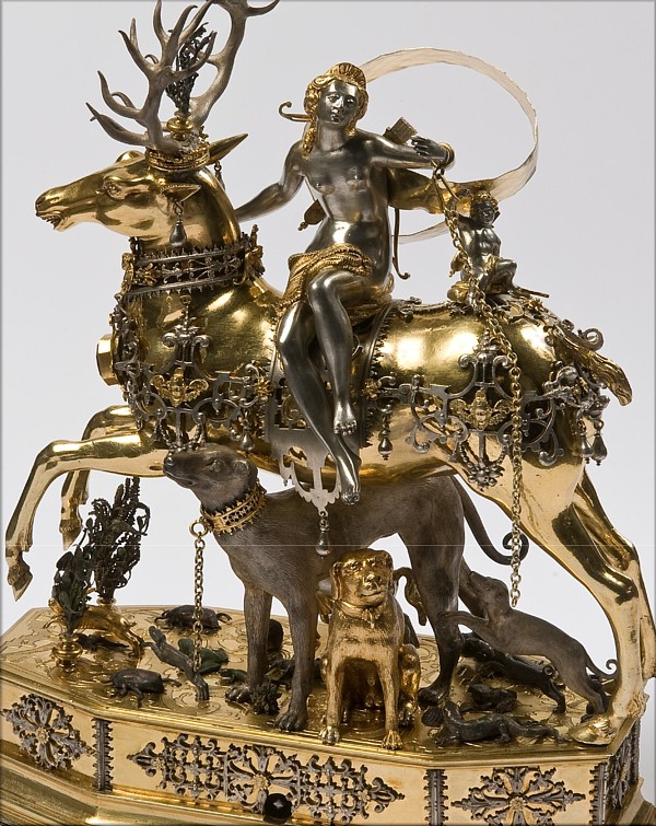 Joachim Fries Esta pieza cuenta con un mecanismo que le permite girar sobre sí misma. Representa a la diosa cazadora Diana montada en un ciervo. En la base vemos otros animales: perros, liebres, reptiles, escarabajos... Este singular objeto se utilizaba para agasajar a los invitados durante la cena y lleva las iniciales del artista que lo creó. Labrada en plata dorada, hierro, citrina y esmaltes, es una muestra de la alta calidad de la joyería de la ciudad de Augsburgo, donde fue realizada a principios del siglo XVII. |