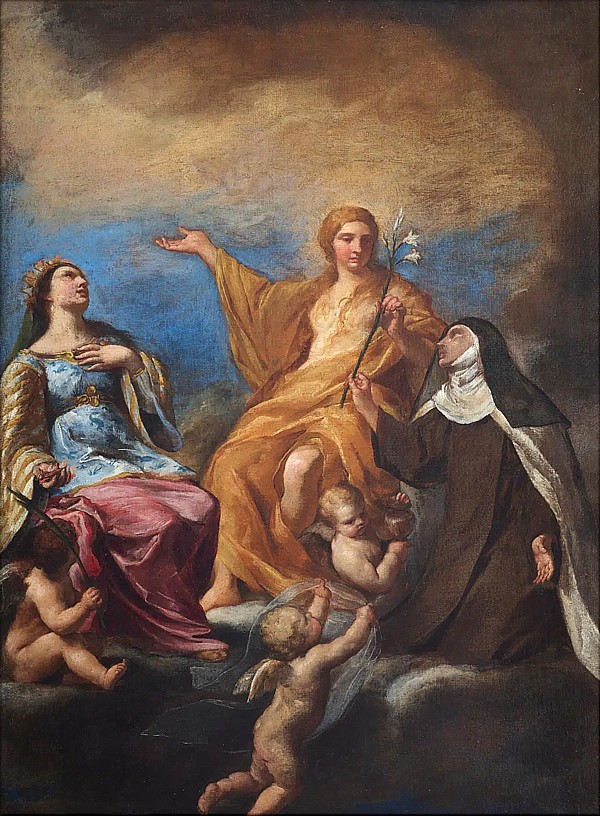Andrea Sacchi El periodo posterior al Concilio de Trento confió a la imagen la tarea de hacer tangible la experiencia espiritual. Otra sección de la muestra, "Formas de devoción. Culto y piedad", destaca cómo los éxtasis, las visiones y las conversiones se convierten en el escenario de la transformación interior: la fe ya no es mera doctrina, sino una experiencia sensorial, y el cuerpo se convierte en el lugar donde se manifiesta lo invisible. Esto se demuestra en Las tres Magdalenas (1633-1634) de Andrea Sacchi (Gallerie Nazionali d'Arte Antica de Roma), donde el contraste entre la sensualidad y la meditación sobre la muerte alude a la tensión entre la carne y la redención. |