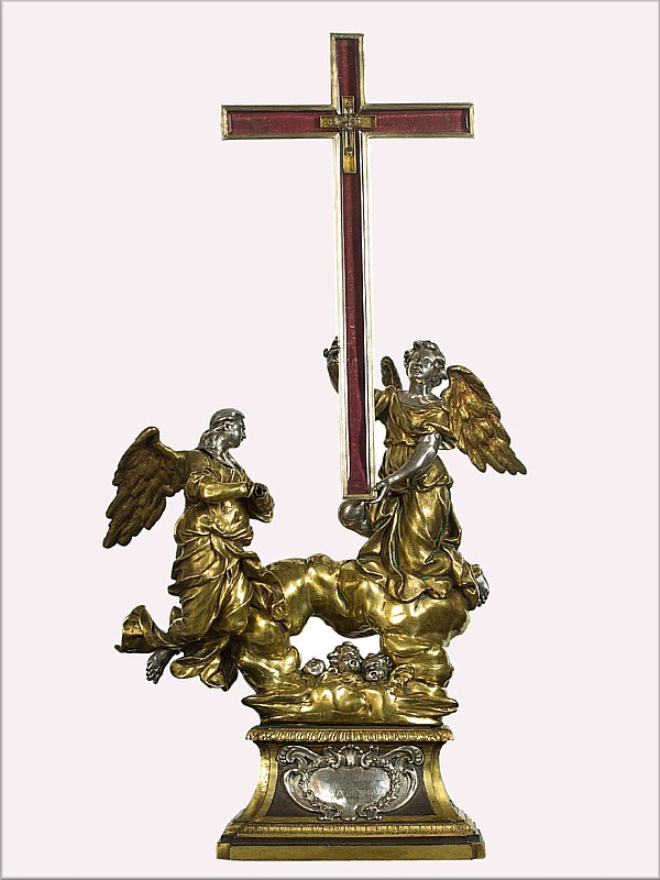 Gian Lorenzo Bernini De nuevo Bernini; en este caso, dentro de la sección "Escenografía de lo cotidiano. Nuevos estilos decorativos", en la que se aprecia claramente cómo la espectacularidad barroca impregna los interiores aristocráticos. Consolas con tableros de mármol policromado, armarios con incrustaciones, copas de nautilo, platería cincelada y tapices heráldicos transforman los hogares en espacios de representación, donde se disuelve la frontera entre lo natural y lo artificial. El Relicario de la Vera Cruz (1644-1645), diseñado por Bernini (Museo Diocesano de Osimo), traduce la teatralidad barroca en un objeto precioso mediante la combinación de bronce dorado, plata, oro y cristal. |