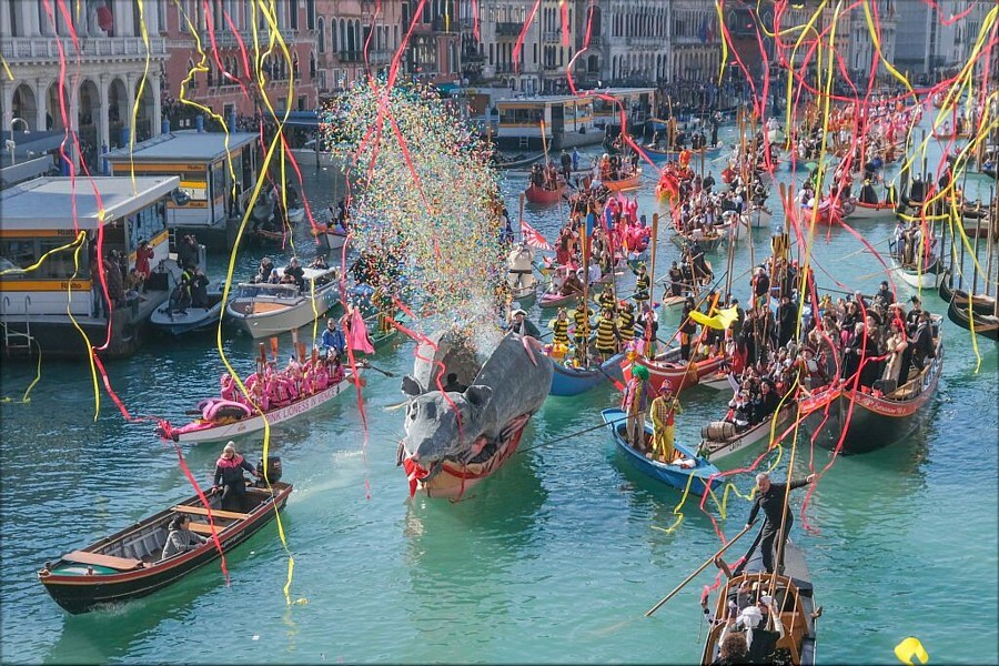 Desfile acuático (Stefano Mazzola/Getty Images) La llamada "Pantegana" es una rata gigante de papel maché, que explota confeti y se desliza por el Gran Canal en el desfile acuático que tradicionalmente inaugura el Carnaval de Venecia en febrero. Este roedor convertido en espectáculo emerge imaginativamente de las alcantarillas de la ciudad como un emblema del lado cómico de Venecia. Con estallidos de color, la rata ofrece un contraste grotesco y brillante al elegante velo luminoso que envuelve Venecia. |
