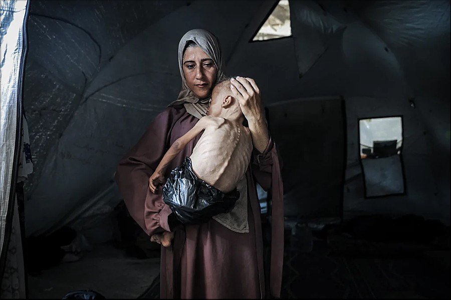 Niño demacrado en Gaza (Getty Images) Una secuencia de imágenes devastadoras de niños demacrados, acunados en los brazos de sus madres en la ciudad de Gaza en julio, conmocionó al mundo. BBC News informó que, según la agencia de refugiados palestinos de la ONU (UNWRA), uno de cada cinco niños en la ciudad de Gaza sufría de desnutrición. La publicación de esta imagen desató controversia tras alegar que el niño representado en la foto también sufría de problemas médicos preexistentes que explicarían su mal estado físico. |