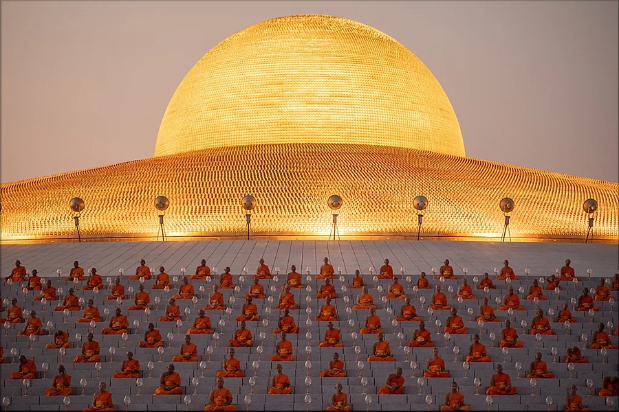 Monjes rezando (Guillaume Payen/Getty Images) Una foto de monjes rezando bajo la vasta cúpula dorada de Wat Phra Dhammakaya (Tailandia) durante la ceremonia anual de Makha Bucha en febrero es sobrecogedora con su resplandor etéreo. Decenas de miles de monjes y devotos, muchos de ellos con linternas, se reúnen para conmemorar la primera gran enseñanza de Buda. |