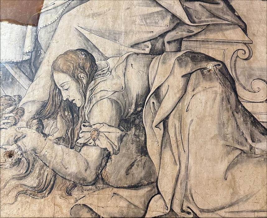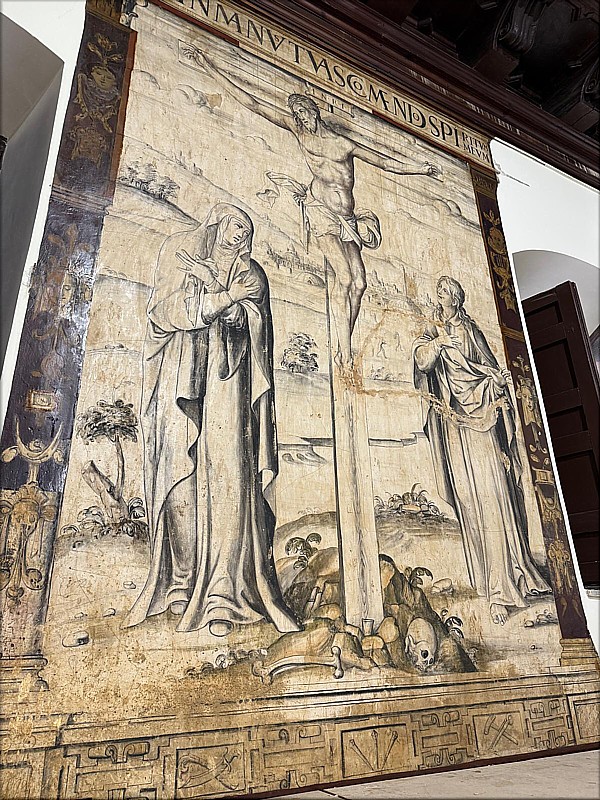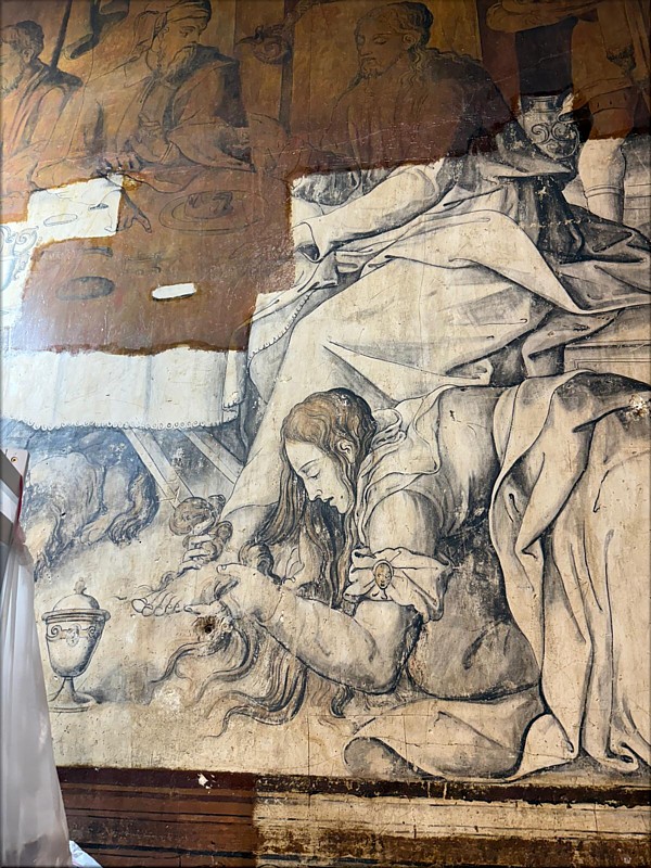 Tres de los muros de la sacristía se decoran con grandes grisallas murales manieristas de autor anónimo. Son cinco piezas de tamaño natural que representan "La entrega de las llaves a San Pedro", "El Calvario" y "La predicación de San Juan Bautista", en el paño frontal, "Santa María Magdalena ungiendo los pies a Cristo", a la derecha, y "La conversión de San Pablo" en el paño de la izquierda. Elías Tormo y Monzó dijo de estas grisallas que eran "obra de uno de los más valientes manieristas rafaelescos que puedan haber pintado en España" y fecha las obras en torno a 1550, aunque Luis García-Saúco consideró que deben de ser por lo menos veinte años posteriores. Esto último se ha ratificado con el hallazgo de la fecha de 1580 en una de ellas. La temática de las pinturas., así como las inscripciones que corren por su parte superior, hacen notar la intención del anónimo artista, o del que hiciera el encargo, de mostrar virtudes u obligaciones que deberían tener los sacerdotes que están en ese lugar, y esta interpretación icónica nos hace pensar que la temática no está elegida al azar. |