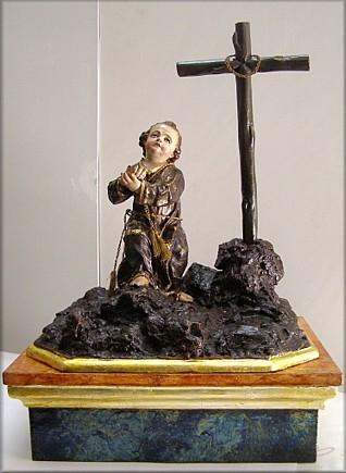 Niño Jesús de la Pasión (Escuela de Salzillo) (I) A pesar de ciertos defectos formales, unas manos y pies un tanto desproporcionados, este Niño Jesús de la Pasión es una obra realmente preciosa. Una pequeña talla (sus medidas máximas, incluida la cruz, son de 52 x 34 x 24,50 cm) de escuela salzillesca (siglo XVIII), con estofados y dorados en plata corlada. El estado inicial de esta bella escultura sacra era llamativo por el gran oscurecimiento que presentaban sus policromías, producto de la aplicación de una gruesa capa de grasas y barnices, los cuales se habían mezclado con depósitos de polvo y distorsionaban notablemente la imagen. |