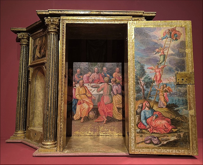 El llamado Sagrario del Resucitado de La Parra (Badajoz) es una obra renacentista anónima (finales del siglo XVI) de extraordinaria belleza y originalidad, especialmente por las pinturas de su interior. En su parte central, la puerta que custodia el Santísimo está decorada con un relieve de Cristo Resucitado, mientras las calles laterales incluyen hornacinas y pinturas de pequeñas dimensiones de los evangelistas Lucas y Marcos. Llaman especialmente la atención las pinturas de gran calidad de la parte trasera de la puerta y del fondo del Sagrario que representan las escenas de "El Sueño de Jacob" y "La Sagrada Cena". Esta última muestra la consternación de los apóstoles tras señalar Jesús que el traidor se encuentra dentro de ellos, ha comido con ellos y ha compartido la mesa con ellos. El traidor, que no es otro que su discípulo Judas Iscariote, aparece en primer plano abandonando la estancia con la bolsa de las 30 monedas en la mano. Respecto a "El sueño de Jacob", muestra este pasaje del Génesis: "Jacob, tomando una piedra de allí mismo, se la colocó por cabezal y se echó a dormir en aquel lugar. Y tuvo un sueño: una escalinata, apoyada en la tierra, con la cima tocaba el cielo. Ángeles de Dios subían y bajaban por ella” (Gen 28, 12). Por tanto, la escalera hace como de "puerta" de acceso al cielo. Eso es la Eucaristía para los cristianos. La obra se conserva en la Parroquia de Nuestra Señora de la Asunción (La Parra), un templo de estilo gótico cuya construcción comenzó en la segunda mitad del siglo XIII, con importantes reformas y remodelaciones efectuadas en los siglos posteriores, sobre todo en el XV y en el XVIII. Hasta el sábado 3 de enero 2026 pueden ver esta pieza en la sala 12 del Museo de la Catedral de Badajoz, junto con la pintura "La niña de la huerta" del pintor extremeño José Gordillo Sánchez. |