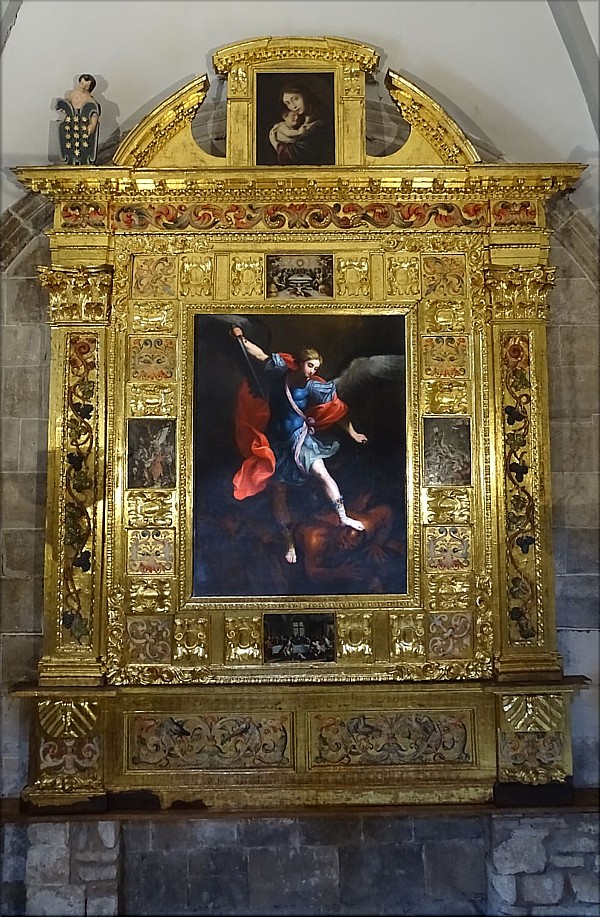 El retablo es una estructura formada por dos cuerpos y ático que arranca de un bancal de piedra. Delante del mismo se ha colocado una mesa de altar. Su planta es lineal. El cuerpo central posee un banco formado por dos ménsulas laterales y un friso de dos casetones decorados "a lo romano" con temple a punta de pincel. Sobre el mismo se ubica un lienzo de gran formato con la imagen de San Miguel Arcángel, rodeado de una enmarcación en la que se representan cuatro escenas de gran calidad pictórica en el centro de cada uno de sus travesaños laterales: la Adoración al Santísimo Sacramento, la Santa Cena, la Crucifixión y el Descendimiento. El resto de la cenefa de la enmarcación aparece decorada con la alternancia de cartelas y pinturas "a lo romano" realizadas a punta de pincel. La enmarcación se adentra en el espacio destinado al arquitrabe en la calle central. Los laterales se cierran con pilastras talladas con las hojas y frutos de la vid sobre las que se sitúan capiteles corintios. Estas estructuras portantes quedan rematadas por un arquitrabe. El cerramiento de este cuerpo central se arma de forma continua mediante un friso decorado con roleos y una cornisa denticulada con un filete de ovas y dardos que queda decorada por modillones. En el ático un edículo central acoge el lienzo de la Virgen con el Niño. Está flanqueado por pilastras y su cerramiento es curvo, con cornisa decorada con ovas y dardos. Lo flanquean unas aletas curvas decoradas en su cornisa con los mismos remates. En el lateral izquierdo, un ángel sustenta el escudo de los Salazar, formado por trece estrellas de oro. |