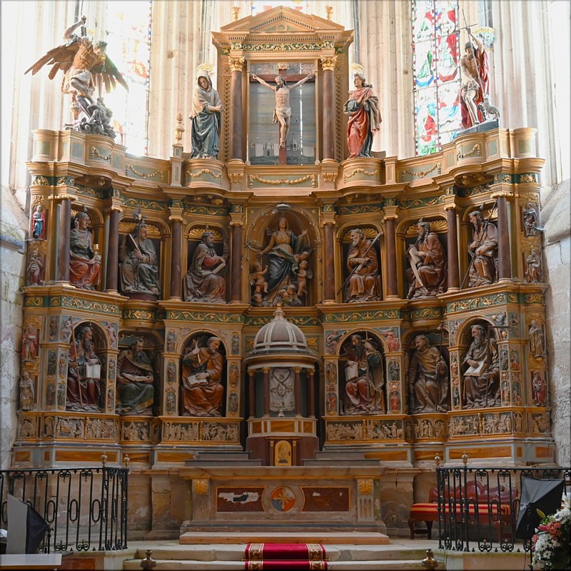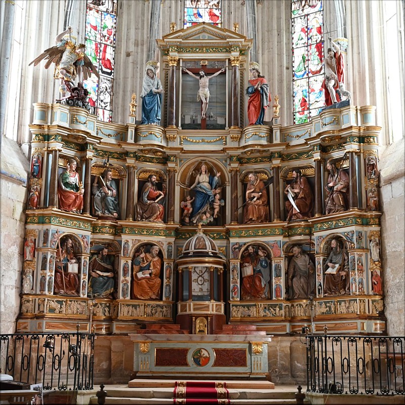 El retablo mayor de la Colegiata de Santa María en Valpuesta (Burgos) es una magnífica pieza renacentista en madera tallada y policromada, con influencia flamenca, de finales del primer tercio del siglo XVI, a excepción del sagrario y sotobanco del primer cuerpo y del ático que son obras de finales del XVIII. La mazonería es de Rodrigo y Martín de la Haya, mientras que las tallas son de Felipe Bigarny y su discípulo León Picardo, pintor y escultor. Según Isabel Fuentes Rebollo, las figuras de los magníficos apóstoles distribuidos en sus dos cuerpos deben ser consideradas de Bigarny. Picardo participaría en la talla y realizó la policromía, si bien la actual data de principios del XIX. El conjunto, semicircular, se acopla al ábside poligonal. Mide 840 x 850 x 250 cm. Contiene 17 figuras exentas, 12 de ellas de tamaño natural representan a los apóstoles. El agregado de cuerpos del retablo está dividido centralmente por una serie de pisos. El ático contiene un Crucificado enmarcado por las imágenes de San Juan Evangelista y la Dolorosa, y a los extremos las efigies de San Miguel Arcángel y San Juan Bautista. En el centro del segundo piso resalta la Asunción de María a los cielos, a los lados de la cual se disponen tres apóstoles sedentes con sus respectivos símbolos. En el primer piso tenemos el sagrario, que imita el famoso templete del Bramante de San Pedro en Roma, que divide a los seis restantes apóstoles sedentes. Sobre el zócalo inferior, color alabastro, está tallada en bajorrelieve la historia de la Virgen desde los desposorios de sus gloriosos padres, hasta su asunción a los cielos. |