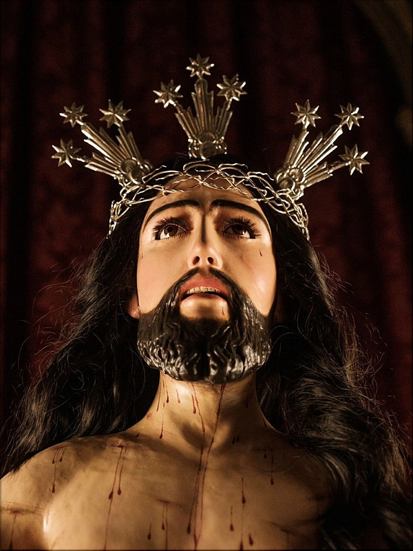 Los elementos que acompañan a Cristo en este conjunto son el Niño Jesús pasionario -no el Ángel confortador como se pensaba- con los atributos de la escalera y la cruz, el Espíritu Santo, Dios Padre y dos angelitos orantes que sostienen otros elementos pasionistas: lanza, tenazas, martillo y esponja. Llevaba también cabezas de ángeles en las esquinas, a media altura sobre unos pequeños ganchos, actualmente desaparecidas. Para Antonio Ramón Jiménez Montes, el origen iconográfico de Nuestro Padre Jesús de las Penas podría estar basado en las visiones de los místicos Juan de Ávila y María Jesús de Ágreda, la Visión del Cordero del Apocalipsis, sermones de San Agustín y los Cantos del Siervo del profeta Isaías. Asimismo, el cronista mostró, durante el acto de presentación de la restauración, algunas obras de arte en las que se podría haber inspirado el hasta ahora anónimo escultor del conjunto: los grabados de Alberto Durero sobre el Varón de Dolores y la Misa de San Gregorio, cuadros del círculo del pintor barroco Antonio del Castillo que se conservan en el Museo de Bellas Artes de Córdoba y una representación pictórica de la Parroquia de Santo Domingo que podría proceder de otro templo egabrense. Jesús de las Penas es una talla completa en madera policromada de tamaño algo menor al natural, con sudario de tela encolada y encaje de hilo dorado al filo. Lleva potencias y peluca y pestañas superiores de pelo natural. La peana que le sirve de base, también de estilo barroco, es de carrete en madera tallada y estofada en pan de oro. Posee la misma cuatro columnas, una en cada esquina, las delanteras mas elevadas que las traseras. |