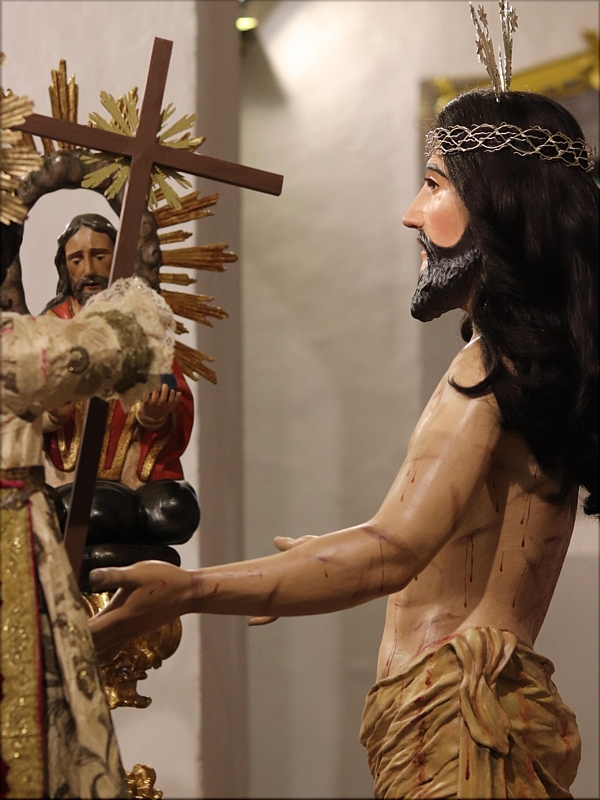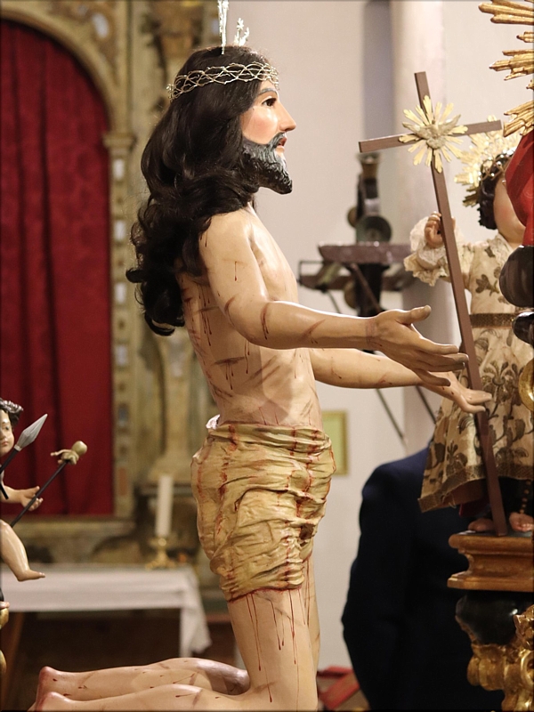 La restauración ha comprendido tanto la talla de Nuestro Padre Jesús de las Penas, titular de la Real Archicofradía de la Santa Vera Cruz de Cabra (Iglesia de San Juan Bautista), como la de las figuras que lo acompañan y la peana barroca tallada y dorada en oro fino en la que se asientan. Los trabajos han sido financiados gracias a las ayudas del Programa de Restauración del Patrimonio Cofrade de la Diputación de Córdoba del pasado año 2024, unas ayudas que han recibido 69 hermandades y que han contado con un presupuesto total de 657.156 euros. Otras intervenciones realizadas por la restauradora de Luque (Córdoba) con dicha financiación son las de Jesús Preso (Aguilar de la Frontera), Oración en el Huerto (Montalbán), Dulce Nombre de Jesús (Córdoba), Jesús Nazareno (Luque), Cristo del Amor (Almedinilla) y Amarrado a la Columna (Rute). La restauración de Cabra no solo ha recuperado los valores plásticos del singular conjunto escultórico de Jesús de las Penas, fechado a finales del siglo XVII o inicios del XVIII, sino también su iconografía original, que no es la de la Oración en el Huerto como se suponía, sino la alegórica del Varón de Dolores. Según Antonio Ramón Jiménez Montes, cronista oficial de Cabra, el grupo pudo pertenecer a la antigua Cofradía del Apocalipsis que estaba en el seno de la Real Archicofradía de la Santa Vera Cruz de Cabra. |