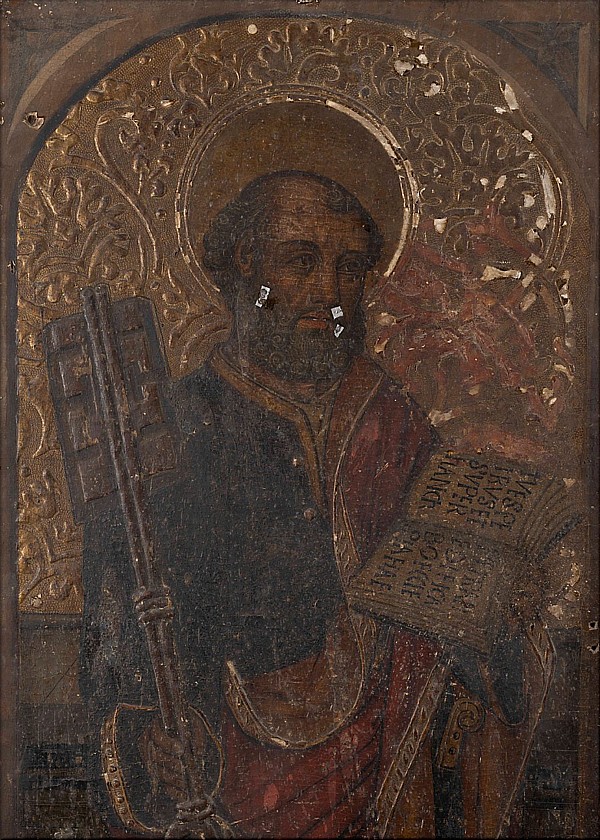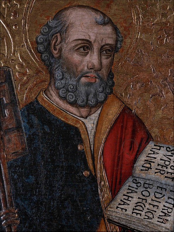 La pieza es una tabla que seguramente formaba parte del retablo mayor de la iglesia parroquial de Sant Pere en Premià de Dalt (Barcelona), obra documentada del escultor alemán Michael Lochner que se destruyó en la Guerra Civil a excepción de sus dos puertas con pinturas de San Pedro y San Pablo. San Pedro está representado según la iconografía tradicional: como un hombre de edad avanzada con barba corta y espesa y pelo rizado y corto, coronado por una aureola que simboliza su condición de apóstol. Su mano izquierda sujeta un libro abierto donde se puede leer "TU ES PETRUS ET SUPER HANC/ PETRAM AEDIFICABO ECCLESIAM MEAM", mientras la derecha porta dos llaves cuyo volumen se encuentra resaltado con la técnica del estofado. La intervención la han llevado a cabo las restauradoras Beatriz Montobbio y Lourdes Domedel en el Centre de Restauració de Béns Mobles de Catalunya (CRBMC) y ha sido posible gracias al apoyo del Arzobispado de Barcelona y el Departament de Cultura de la Generalitat de Catalunya. |