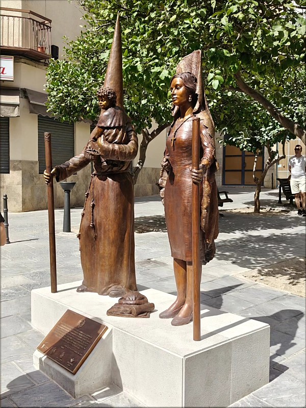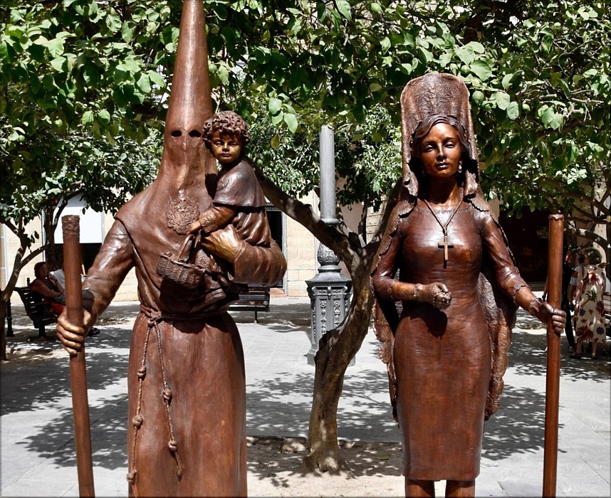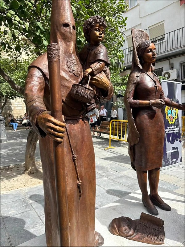 Monumento al cofrade de la ciudad de Jaén La última obra del escultor e imaginero sevillano es un conjunto escultórico de tipo monumental. Una escultura pública realizada a tamaño natural, en bronce fundido mediante la técnica de la cera perdida. Está formado por un nazareno que representa el acompañamiento silencioso a los titulares de las hermandades de penitencia y sostiene a un niño vestido con el hábito de monaguillo, símbolo de traspaso del legado cofrade de padres a hijos, y por una mujer ataviada con la mantilla que escenifica su acompañamiento en los distintos cortejos procesionales de la Semana Santa y el Tiempo de Gloria de la ciudad de Jaén. Como último elemento descriptivo aparece en el suelo el costal y la faja, representando a los costaleros que portan a sus titulares en el procesionar de las cofradías, elemento fundamental en la idiosincrasia de las expresiones religiosas y culturales en el discurrir de una procesión del sur de España. Este monumento, inaugurado a escasos días de la celebración en Jaén del Rosario Magno organizado por el Obispado jiennense con motivo de la celebración del Jubileo de la Esperanza, se ha ubicado en la Plaza de Cervantes, un punto estratégico de la capital situado en el casco antiguo de Jaén, que concentra edificios emblemáticos como la Catedral, el Centro Cultural Baños Árabes de Jaén, el Antiguo Hospital de San Juan de Dios o la Iglesia de Santo Domingo, que muy pronto abrirá sus puertas para estar a disposición de la ciudad en la zona de San Miguel. |