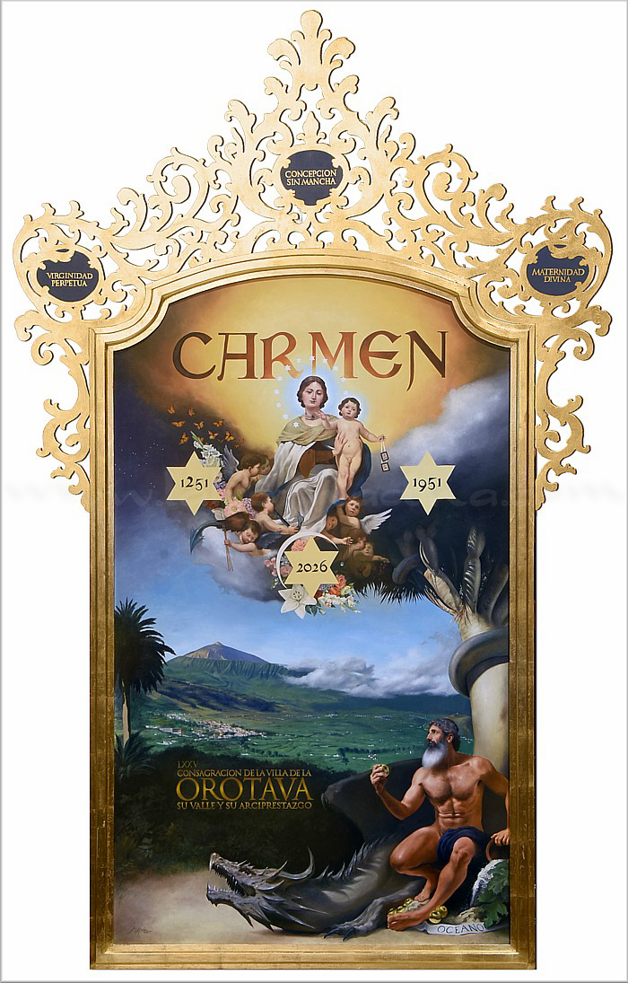 La Cofradía del Carmen de la Villa de La Orotava (Tenerife) ha presentado el cartel que dará imagen visible a una efeméride tan señalada como esperada para esta villa tinerfeña: el 775º aniversario del Santo Escapulario y el 75º aniversario de la consagración de la Villa de La Orotava, su Valle y Arciprestazgo a la Santísima Virgen en su advocación del Monte Carmelo. Con el lema La Orotava, Villa Mariana, Villa Carmelitana. 1251-1951-2026, la localidad acogerá con gran entusiasmo un gran programa cultural y religioso durante el próximo año 2026, contando con exposiciones de arte, ciclos de conferencias y varias procesiones extraordinarias con la afamada y venerada imagen de Nuestra Señora del Carmen de esta monumental Villa. El cartel, un óleo sobre tabla de gran formato (234 x 150 cm), ha sido realizado por el artista Josué Hernández, incluido el diseño de su elaborada guarnición dorada, un marco que evoca el estilo difundido con éxito en Canarias en siglos pasados, uniendo lo antiguo y lo contemporáneo, y que pone en valor el enorme trabajo y artesanía de las carpinterías locales, especialmente en el calado de la madera realizada por la carpintería villera de Victor Manuel López e Hijos y cuyo dorado ha recaído en las manos de David García Toste. |
