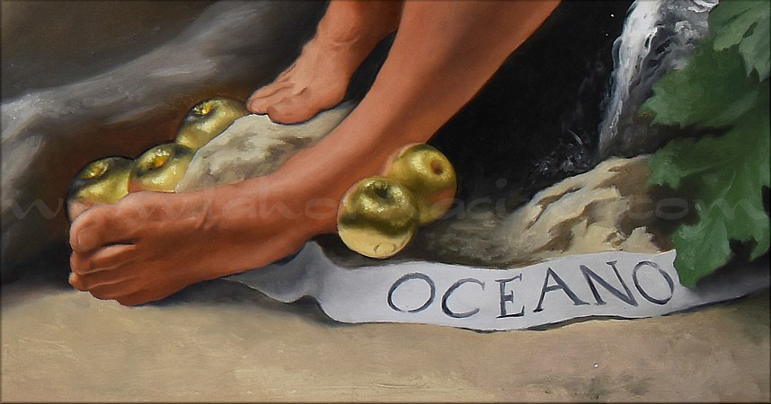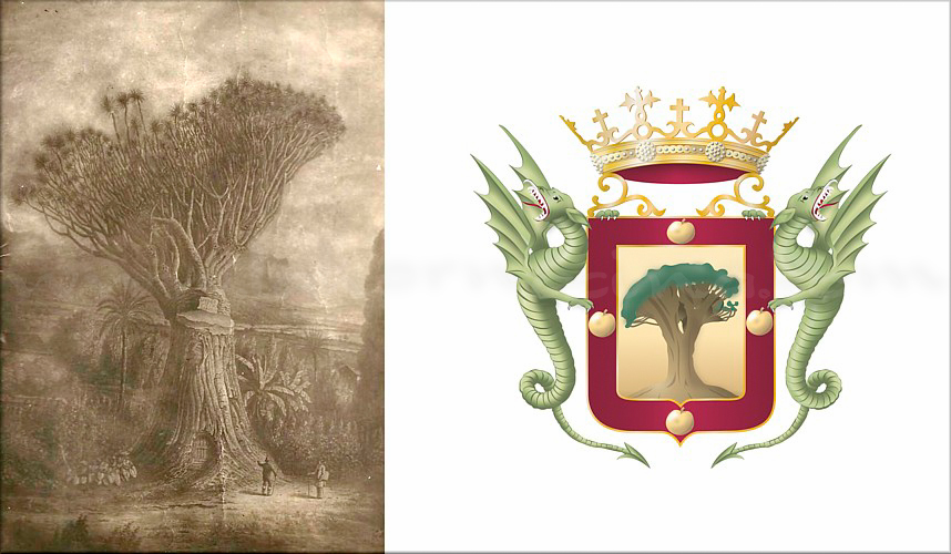 La obra centraliza la mirada en la figura de María, inspirada en la imagen titular de la Cofradía del Carmen que, sentada sobre una nube llena de querubines, inunda de luz la escena como "Estrella hermosa que anuncia el día" sobre la noche oscura que se ejemplifica en el cielo purpúreo tras la constelación de Hércules, personaje mitológico vinculado con el jardín de las Hespérides y con el archipiélago canario. Ofreciendo a su divino Hijo, la Reina y Hermosura del Carmelo aparece flanqueada por las tres estrellas del Carmelo: concepción sin mancha, virginidad perpetua y maternidad divina. Tres estrellas que, escritas en el pecho de esta venerada imagen mariana de Tenerife, han servido para representar en ellas las fechas de estos tres aniversarios donde, para representar al valle y arciprestazgo, aparecen ángeles portando fuegos artificiales por Los Realejos y su fiesta del 3 de mayo, el ancla por el Puerto de la Cruz y su importancia marinera y una lluvia de pétalos por La Orotava, aludiendo a su fiesta más importante: la infraoctava del Corpus Christi. En la mitad inferior de la composición aparece la vista más popular del Valle de La Orotava, inspirada en su aspecto hacia mitad de siglo XX, representando aquel mítico jardín de las Hespérides antes mencionado, que la tradición ha identificado como las Islas Canarias y que así lo materializa el escudo heráldico de La Orotava, fuente de inspiración iconográfica para el cartel, donde su manzano que daba frutos de oro puro ha sido sustituido por un drago de Canarias ("Dracaena draco") que evoca el monumental ejemplar que se erguía en la Villa hasta que un vendaval causó su desaparición el 7 de marzo de 1867 y donde se halla la ermita de Nuestra Señora del Carmen, que fundada por la familia Franchi en 1558, fue clave para la difusión del culto al santo escapulario en el archipiélago. Es por ello que a sus pies se encuentra el dios Océano, personificando a las Islas Canarias -nombre citado como lema en la heráldica de las islas desde antiguo- y que sostiene las manzanas de oro en representación de los pueblos del valle y del arciprestazgo de La Orotava en 1951. Y como cierre, el dragón Ladón, custodio del jardín, que muchos han querido identificar como El Teide, en reverencia ante la aparición mariana. |