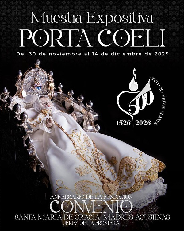 La exposición Porta Coeli conmemora la llegada de la Orden Agustina a Jerez y por ende el 500 Aniversario de la fundación del Convento de Santa María de Gracia de Madres Agustinas (1526-2026). Esta muestra, que iba a clausurarse el próximo 14 de diciembre pero ha sido prorrogada hasta el domingo 21 de diciembre de 2025, es una cita cultural e histórica que ofrece a los visitantes un recorrido único por el patrimonio y la espiritualidad del convento, a través de piezas nunca antes expuestas al público. Porta Coeli está comisariada por José Antonio Román Holgado y María Cristina López García. Además ha contado con la colaboración de José Manuel Moreno Arana en lo que respecta a la catalogación de unas imágenes que revelan el rico acervo artístico que atesora el cenobio. Dirección y horarios: Calle Santa María de Gracia 2, Jerez de la Frontera. Lunes a viernes, de 10:00 a 14:00 horas y de 17:00 a 20:00 horas; sábados, domingos y festivos, de 09:00 a 14:00 horas. |