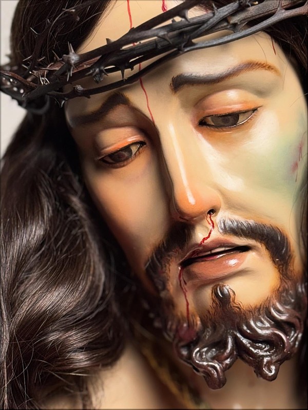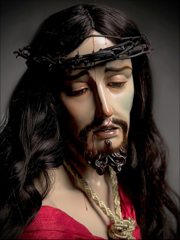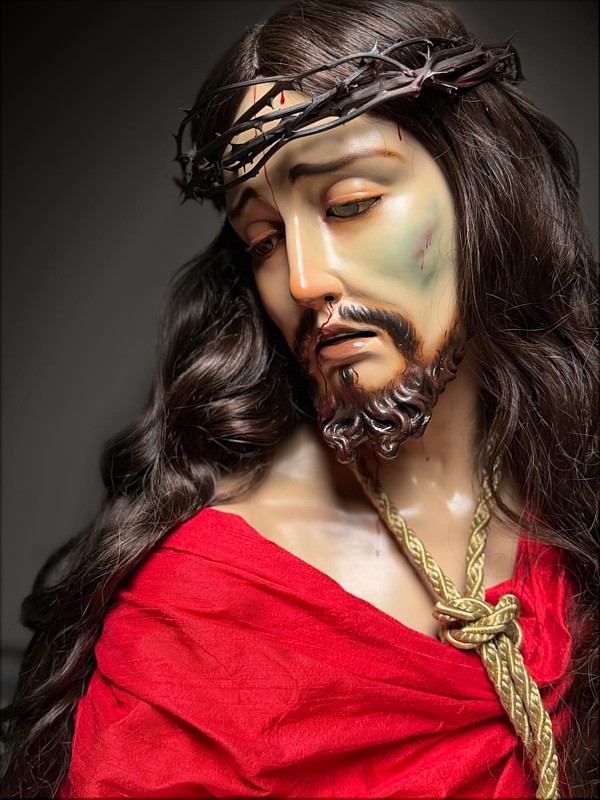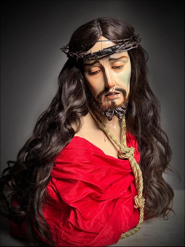 La sede malagueña del establecimiento textil Ribes & Casals (Sebastián Souviron, 20) muestra en uno de sus escaparates, desde finales del pasado mes de febrero, una de las últimas obras del escultor e imaginero malagueño Juan José Postigo. Se trata de un busto del Ecce Homo que, por sus caracteres, se centra en la cara de Cristo, de fuerte realismo. Como es habitual en el autor, rememora las magníficas esculturas sacras del Barroco creadas en la zona de Andalucía Oriental; en este caso, los modelos granadinos del siglo XVII realizados en el taller de los Mora. |