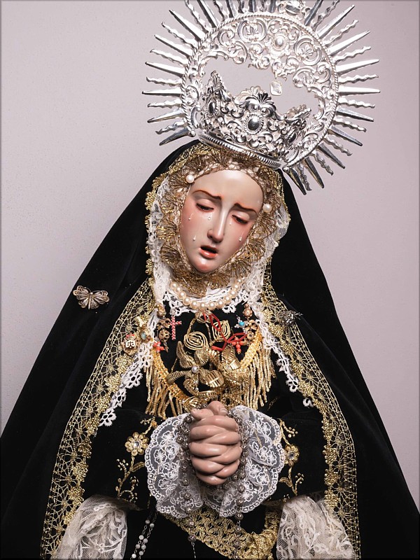 De hecho, el rostro alargado y enflaquecido, de gran expresividad y con el pómulo izquierdo amoratado, puede relacionarse en concreto con las obras pasionistas de José de Mora. Lo demás en esta pieza es superpuesto: corona de espinas, peluca, cíngulo dorado y clámide de tejido natural. Otra obra reciente de Juan José Postigo, llamada Virgen de Fe y Consuelo (imagen inferior) por una de las dolorosas titulares de la Hermandad del Monte Calvario (Málaga), atribuida a Antonio Asensio de la Cerda (hacia 1770-1771), se inspira en las creaciones de esta saga de escultores-imagineros. |