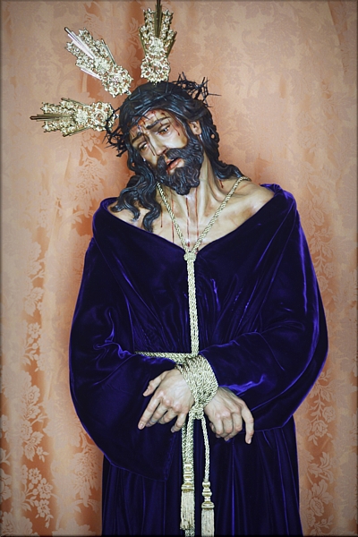 Eduardo Sánchez Aranda Dramática hechura cristífera con el título de Señor de la Redención, realizada por el escultor y pintor bolañego, afincado en Andalucía, para una colección particular del municipio gaditano de Puerto Real. Es una figura de tamaño natural (mide 182 cm de altura) con el busto, las manos y los pies labrados en terracota, siendo el resto del cuerpo un candelero oculto por prendas de tejido natural. Lleva policromía al óleo, pestañas de pelo natural y una lágrima de cristal en su mejilla derecha. Representado tras el escarnio, de pie y maniatado, este simulacro pasionista fue bendecido el pasado 10 de julio en el templo puertorrealeño de San Benito Abad. El atuendo corresponde al diseñador David Calleja. |