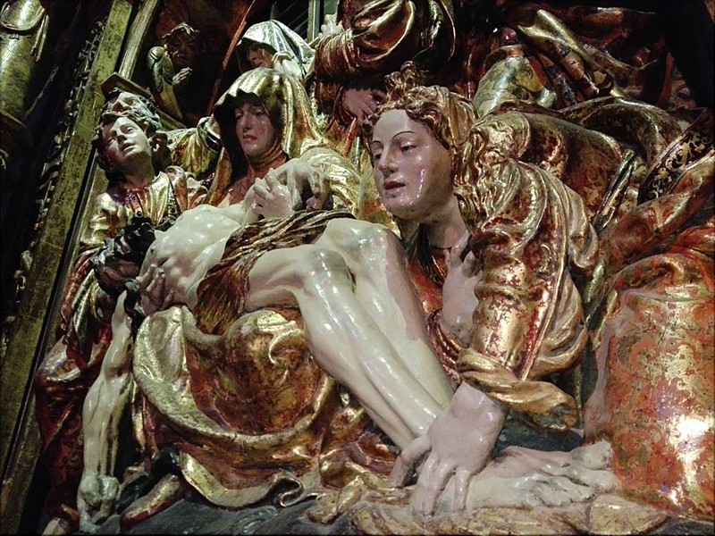 El retablo de la Quinta Angustia, considerado una de las mejores piezas escultóricas del renacimiento español, se halla ubicado en el brazo norte del transepto de la Catedral de Ourense. Fue realizado por el llamado Maestro de Sobrado, artista de origen borgoñón y miembro del círculo artístico del maestro Juan de Juni. La empresa restauradora es Alquimia Restauración y los trabajos de reparación, cuyo plazo es de dos meses, se hallan dirigidos a eliminar el notable grado de suciedad y daños que presenta la fábrica. Este impresionante retablo, también conocido como el retablo de San Benito, consta de ático y cuerpo principal donde se halla el magnífico altorrelieve del Duelo centrado por la Virgen con Cristo muerto en su regazo que le da título. La policromía del conjunto corrió a cargo de Tomas de Celma, pintor y rejero de profesión. |