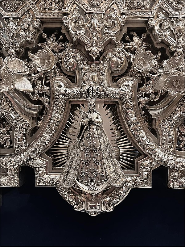 En el centro del frontal, presidiendo todo el conjunto, figura la que es patrona de México y heredera de la advocación extremeña, representada entregando las rosas de Castilla al indio San Juan Diego Cuauhtlatoatzin, a quien se le apareció la Virgen hasta cuatro veces. Tras la primera aparición, ordenó a Juan Diego que se presentara ante el primer obispo de México, Juan de Zumárraga, para decirle que era voluntad de la Señora que se le erigiera un templo. El obispo mostró escepticismo y pidió una prueba a Juan Diego. En la última aparición de la Virgen, y por orden suya, Juan Diego llevó en su ayate unas rosas que cortó en el Tepeyac, se dirigió al palacio del obispado y desplegó su ayate ante el obispo Zumárraga, dejando al descubierto la imagen de la Virgen María, morena y con rasgos mestizos. Esta escena la contempla un pájaro mexicano tzinitzcan, pues con su canto anunció la aparición de la Reina del Cielo a Juan Diego. Las rosas que la Virgen entrega al santo nacen en la citada escena, pero se extienden y rodean todo el respiradero, siendo prueba y muestra de la verdad de la fe del pueblo sevillano cada Lunes Santo. Son rosas realizadas como flores exentas que van descansando sobre las molduras y ménsulas del respiradero. La estructura ornamental de este respiradero tiene inspiración en los paños de sebka de la Giralda, de filiación almohade, con sus cruces de líneas que crean espacios en los que en unos van las patronas hispanas, en otros las rosas guadalupanas y en otros ornamentación vegetal. Las flores de jara, características de Extremadura, aparecen también en estos cruces. En las cuatro esquinas, querubines crean la sensación de elevar y procesionar todo el conjunto en homenaje a los costaleros que con su esfuerzo permiten a la Hermandad de las Aguas cumplir su estación de penitencia. Remata la escena central en la parte superior una corona inspirada en la fantástica obra del insigne orfebre Fernando Marmolejo que también remata el altar de la Hispanidad de la Basílica de la Esperanza Macarena. Por último, el reconocido taller sevillano Orfebrería Ramón León quiere pone en valor la gran colaboración que han tenido en la ejecución de esta obra con el escultor e imaginero Álvaro Abrines, autor de los modelos de todas las imágenes que figuran en el respiradero. |