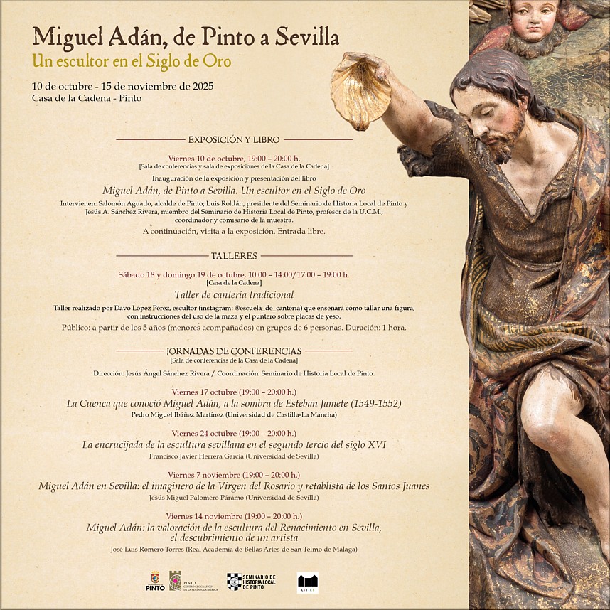 El Ayuntamiento de Pinto, a través de la Concejalía de Emprendimiento y Turismo, y el Seminario de Historia Local de Pinto organizan las Jornadas de Patrimonio Histórico, que se inauguran en la localidad madrileña el próximo viernes 10 de octubre y continuarán hasta el 14 de noviembre. En esta edición, las jornadas rinden homenaje y recuerdan la figura del artista local Miguel Adán, uno de los escultores, imagineros y retablistas más importantes de los siglos XVI y XVII. Entre sus principales obras conservadas se encuentran los sepulcros en mármol con las estatuas yacentes de la segunda esposa y una de las hijas de Hernán Cortés, Juana de Zúñiga y Catalina Cortés, en el Convento de Madre de Dios de Sevilla. También fue artífice de la imagen de la Virgen del Rosario de Palomares del Río (Sevilla), el Cristo de la Vera Cruz y la Virgen del Rosario de la Iglesia de la Purísima Concepción de Villanueva de los Castillejos (Huelva) y el retablo de San Juan Bautista para el Convento de las Dueñas de Sevilla (Museo de Bellas Artes de Sevilla). El 10 de octubre, a las 19:00 horas, en el Salón de Actos de la Casa de la Cadena (Calle de la Cadena 15, Pinto) se abren las Jornadas con la inauguración de la exposición y presentación del libro Miguel Adán, de Pinto a Sevilla. Un escultor en el Siglo de Oro. Intervendrán el Alcalde de Pinto, Salomón Aguado, Luis Roldán, Presidente del Seminario de Historia Local de Pinto, y Jesús Ángel Sánchez Rivera, miembro del Seminario de Historia Local de Pinto, profesor de la Universidad Complutense de Madrid (UCM), coordinador y comisario de la muestra. A partir de ahí, se desarrollará toda una programación de talleres y conferencias en torno al artista pinteño. Las inscripciones a los talleres ya están abiertas en la Plataforma Municipal de Reservas. Miguel Adán (Pinto, Madrid, hacia 1532 - Sevilla, hacia 1607), insigne pinteño, escultor y retablista, que desarrolló su actividad artística entre Cuenca, Toledo y Sevilla. Adán fue hijo de los toledanos Miguel Adán y María Hernández, quienes tuvieron, al menos, otros cuatro hijos ligados a Pinto. A partir de 1549, el joven Miguel Adán se formaría en Cuenca bajo la tutela del francés Esteban Jamete, destacado artista del Renacimiento que en aquel momento trabajaba para la catedral. Despúes, Adán residiría en Toledo entre 1553 y 1561, aproximadamente, en casa de uno de los principales escultores del momento, Juan Bautista Vázquez el Viejo, trabajando en su obrador. Al mediar esta etapa toledana, en 1557, está documentada la intervención de Adán como testigo durante un proceso contra Jamete -su antiguo maestro- del Tribunal de la Inquisición. Adán continuaría trabajando en el taller de Vázquez el Viejo como oficial hasta que, en 1561, se trasladara con él y otros de sus colaboradores a Sevilla para terminar el retablo mayor de la cartuja de las Cuevas. Los artífices castellanos llegados con aquel maestro terminarían por establecerse en la ciudad, por entonces la más próspera de la península ibérica -junto con Lisboa- gracias al comercio con América. De este modo, el pinteño se examinaría en 1573 ante el gremio hispalense de escultores y entalladores. Facultado para el ejercer su oficio de forma independiente, Miguel Adán realizaría diversas obras (imágenes, retablos, sepulcros) para distintos lugares de la ciudad y para otras localidades andaluzas, proyectando su actividad, incluso, hasta las islas Canarias. Asimismo, ejercería como examinador de su gremio, tarea en la que aprobaría al mismísimo Juan Martínez Montañés, célebre escultor del barroco hispalense, que más tarde casaría con una nieta de Adán. Los distintos productos y actividades que engloban estas Jornadas de Patrimonio Histórico (libro, exposición, talleres de cantería y conferencias) contribuirán, sin duda, a un mayor y mejor conocimiento del pinteño Miguel Adán, siempre en el marco de aquel período de esplendor cultural que conocemos como Siglo de Oro español. |