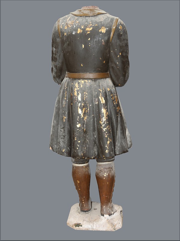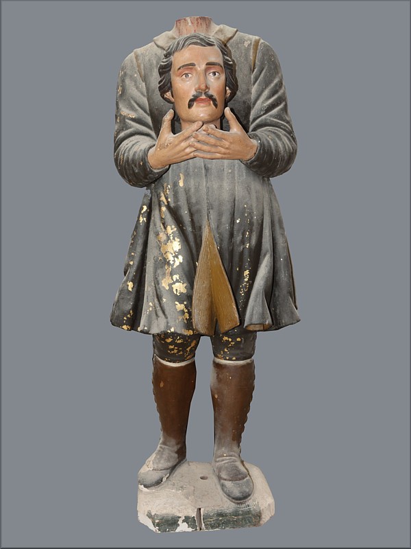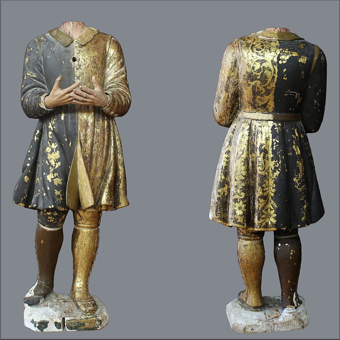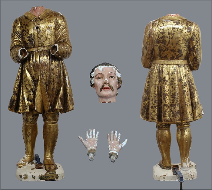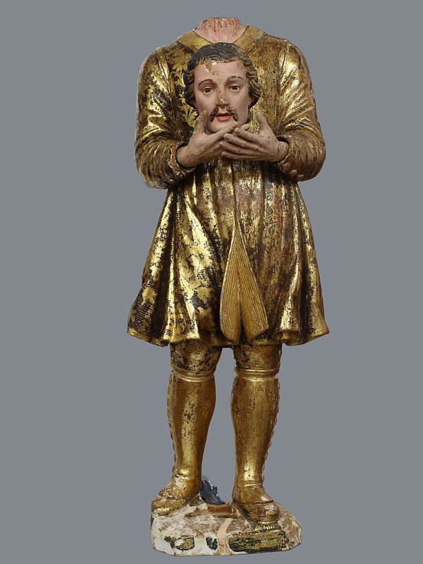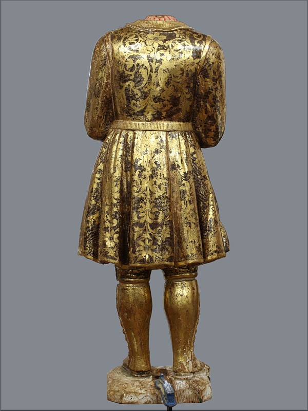 Esta magnífica talla romanista de San Lamberto, de autor anónimo y catalogada en el siglo XVII, recibe culto en la Catedral de Tarazona y ha sido restaurada por la Fundación Tarazona Monumental dentro de su puesta en valor de los bienes muebles más relevantes de la localidad aragonesa. La escultura presentaba un agresivo repinte oscuro que ocultaba por completo su policromía original. Tras su eliminación, y las tareas de limpieza y reintegración cromática llevadas a cabo, hoy vuelven a brillar los delicados esgrafiados a base de motivos vegetales, testimonio de la extraordinaria calidad técnica de la obra. |