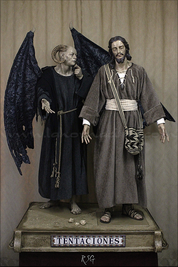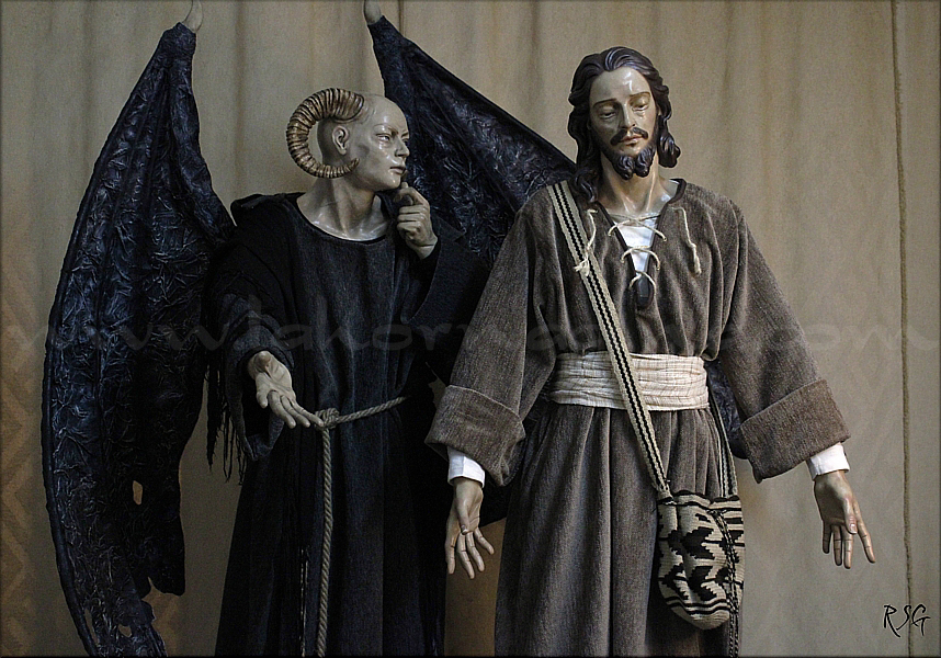 En la primera tentación, el diablo tienta a Jesús a que convierta las piedras en pan, a lo que éste respondió: "no solo de pan vive el hombre, sino de toda palabra que sale de boca del Señor". Más tarde, en lo alto del templo de Jerusalén, le reta a lanzarse al vacío para demostrar que es el verdadero hijo de Dios, a lo que Jesús se niega rotundamente. Por último, en un monte muy alto situado en las proximidades de Jericó, el diablo le dice: "te daré todo esto, si te postras y me adoras", pero Jesús le replicó y acudieron los ángeles a buscarle. Sánchez García, madrileño afincado en Córdoba, actualmente con taller en Aguilar de la Frontera, afirma también que esta síntesis iconográfica ha conocido a lo largo de la historia representaciones en grabados, pinturas y relieves, pero nunca había sido objeto de una interpretación escultórica de conjunto. Y el artista lo hace bajo su peculiar prisma de la imaginería andaluza, con dos tallas para vestir de tamaño algo inferior del natural y policromadas. |