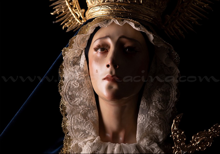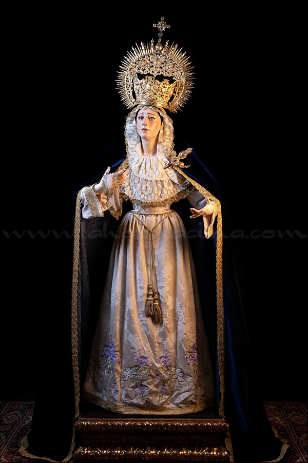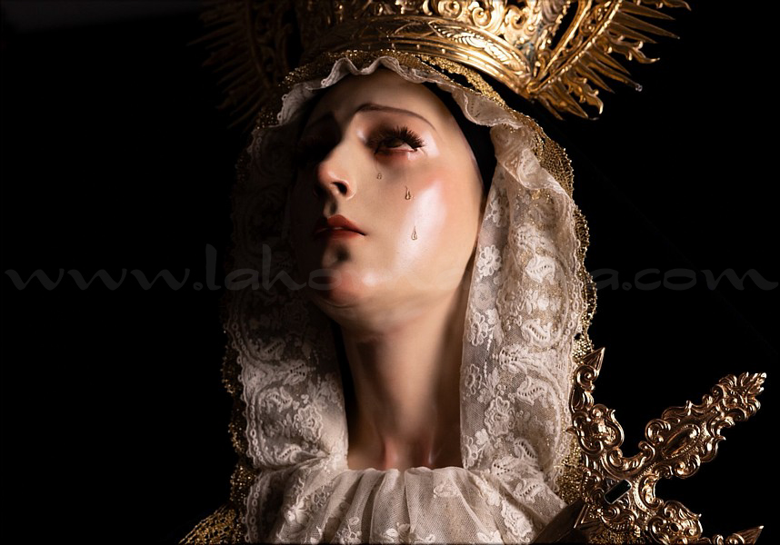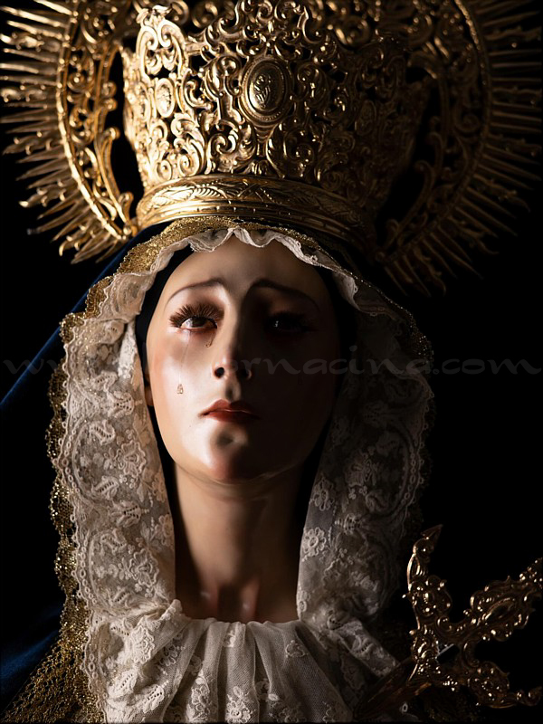 Virgen de la Misericordia Dolorosa de candelero para vestir, inspirada en los modelos clásicos del barroco. Primera imagen mariana realizada a tamaño natural por el autor. La cabeza, suavemente elevada, busca consuelo en lo divino. La mirada, de hondo dolor contenido, dirige al espectador hacia un instante de silencio y contemplación. Cinco lágrimas de vidrio fundido, elaboradas totalmente a mano, recorren sus mejillas con un realismo conmovedor, acentuando la expresión de aflicción sagrada. La policromía al óleo, aplicada con sentido clásico, dota a la obra de matices y viveza, resaltando los rasgos con delicadeza y dramatismo. La obra, titulada María Santísima de la Misericordia, tene como destino la localidad granadina de Loja, consolidándose como un testimonio de compromiso artístico y devocional por parte del joven artista cordobés. De cara a su presentación ha sido ataviada por Francisco Rodriguez Ruiz. |