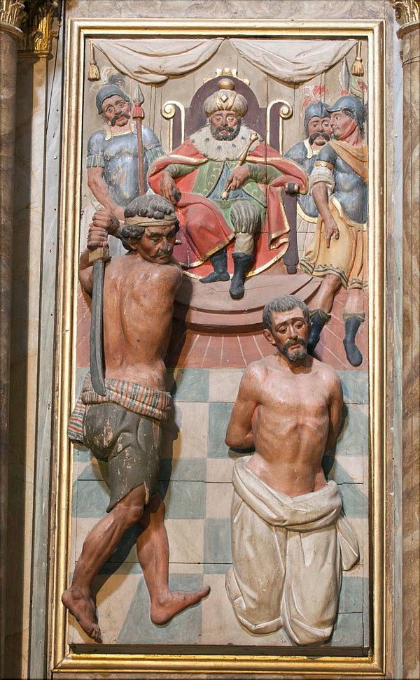 Así, el artículo Un retablo y algunos relieves inéditos de Blas Molner, de Manuel García Luque, estudia un conjunto de relieves atribuibles al escultor académico Blas Molner. El primero de ellos representa el tema de la Asunción de la Virgen y se conservó hasta 1936 en la iglesia del convento de las mercedarias de San José de Sevilla. Otros cuatro forman parte del programa iconográfico del retablo de San José de la parroquia de San Miguel de Cumbres Mayores (detalle del martirio de San Julián en la imagen superior), cuya estructura arquitectónica también atribuimos al escultor. Este trabajo reflexiona sobre la capacidad de Molner como escultor de relieves e indaga en las fuentes gráficas en las que pudo inspirarse para componer las diferentes escenas. Foto: autor |
