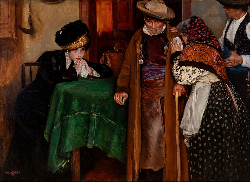 El Museo de Bellas Artes de València (MuBAV) ha presentado las nuevas salas de su colección permanente dedicadas a la España Negra y la crítica social, que se desarrolló desde finales del siglo XIX, y a la vanguardia figurativa española durante las primeras décadas del siglo XX. Las nuevas salas, situadas en la planta tercera del edificio Pérez Castiel del MuBAV, están conformadas por 28 pinturas, entre las que destacan ocho recientes adquisiciones de la Generalitat para el patrimonio público valenciano que se presentan, por primera vez, en sala tras su compra y acondicionamiento en el Departamento de Restauración del MuBAV. Es el caso de Carnaval en las Ventas de Gutiérrez Solana, La hija pródiga de Carlos Vázquez Úbeda (imagen superior), Retrato de María Teresa Llavallol de Atucha de Ignacio Zuloaga (imagen inferior), Mujer con su bebé en el campo de Julio González, Retrato de José Pereira da Graça Aranha de Daniel Vázquez Díaz, Retrato de Miguel de Unamuno de Juan de Echevarría, Retrato femenino de Pere Pruna y El joven torero de Emilio Grau Sala. También se incorporan por primera vez a sala La niña de la sopa, obra de la artista María Blanchard que fue adquirida en 2025 por el Ministerio de Cultura, y Retrato de Larrauri de Enrique Albizu, que fue donada por la familia Albizu a la institución valenciana el año pasado. Con la apertura de estas dos nuevas salas, el MuBAV completa el discurso museográfico de las galerías expositivas del edificio Pérez Castiel en el que se exhibe las colecciones artísticas de los siglos XIX y XX. La pintura de temática social se desarrolló notablemente a finales del siglo XIX como resultado de los cambios políticos y sociales que habían sacudido Europa durante toda la centuria. Este género alcanzó el éxito en España a partir del triunfo de Luis Jiménez Aranda en la Exposición Universal de París del año 1889 con la obra La sala de hospital durante la visita del médico. En València, la figura capital de la pintura crítica fue Antonio Fillol Granell quien, en obras como El amo o Después de la refriega (imagen inferior), representó con toda crudeza el atraso de las sociedades rurales y la violencia de los conflictos sociales. |