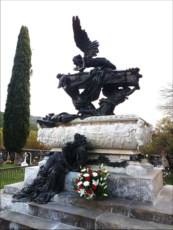 Este impresionante mausoleo está dedicado al tenor Julián Gayarre (1844-1890) y fue esculpido por el célebre escultor Mariano Benlliure (Valencia, 1862 - Madrid, 1947). La obra se ubica en el cementerio de Roncal (Navarra), localidad natal de Gayarre, sobre una base de lajas rectangulares y cuatro gradas de mármol gris. Sobre estas, se apoya la urna labrada en mármol blanco de Carrara. Los restos mortales del tenor, gran amigo de Benlliure, descansan en una cripta situada bajo la escultura. En las esquinas cuatro querubines tallados en altorrelieve y en los laterales aparecen labras en bajorrelieve con la representación de varios niños que sostienen y cantan letras de las óperas que el tenor representó. El vaso está profusamente adornado con grecas talladas, pequeños rostros esculpidos y bajorrelieves con representaciones de figuras míticas y humanas. También presenta una guirnalda metálica formada con flores y bucráneos. En el lado este del zócalo, una escultura representando la musa de la música, se encuentra recostada y apoya su cabeza sobre el vaso. Viste con túnica y a la altura de la vista del espectador se distingue el minucioso recogido del pelo. El rostro aparece muy afectado y está orientado hacia el vaso. Sostiene una lira con las cuerdas rotas en alusión al silencio producido por el óbito del tenor. En el lado del vaso orientado hacia el oeste, se encuentra un paño labrado con sus pliegues depositados sobre vaso y gradas, realizado en bronce. En las esquinas de la grada superior aparecen cuatro calaveras de bóvidos fundidas en bronce. Sobre el vaso, emergiendo de una plancha metálica que sujeta todo el grupo, las musas que representan la Armonía y la Melodía izando en sus manos un ataúd de bronce, decorado con bajorrelieves de putti, elementos alegóricos al triunfo, y grupos de flores, en consonancia con el estilo naturalista de la época. Sobre el ataúd metálico, la Fama simbolizada como un ángel con las alas desplegadas que se inclina apoyando la cabeza cerca del féretro intentando escuchar la voz del tenor. Las cuatro figuras metálicas tienen tamaño natural, también la urna de mármol y el féretro de bronce. El conjunto se eleva varios metros sobre el zócalo. En esta obra queda de manifiesto el dominio técnico de Benlliure, que trata con gran esmero los dos materiales constitutivos, así como su dedicación por plasmar el detalle en figuras, cenefas, guirnaldas vegetales, bucráneos, etcétera. Refleja su conocimiento de la escultura clásica y la influencia de nuevos estilos. Merece destacar el dinamismo compositivo abandonando toda simetría, logrando resultados de estética modernista. Si bien el mausoleo tradicionalmente se ha enmarcado dentro de este periodo estético, la obra expresa la intensidad emocional y el estado anímico del escultor tras el fallecimiento de su amigo, y pudiera también atribuirse a un tardío romanticismo con trasfondo neoclásico. Las figuras principales de las musas poseen un poder simbólico y evocador, al igual que los niños cantores con las partituras. El grupo monumental se esculpió en el taller italiano de Benlliure entre 1891 y 1895. El 11 de octubre de 1890 el escultor ya había realizado un diseño preliminar del mausoleo que se publicó en la revista "La Ilustración Española y Americana". La obra definitiva presenta ligeras variaciones, como el posicionamiento de la cabeza de la música. En 1895 el conjunto escultórico estaba terminado, aunque no se instaló en el cementerio de Roncal hasta 1901. El escultor lo expuso en varias bienales y ferias de arte antes de llegar al pueblo pirenaico. En 2016 la obra fue ejemplarmente restaurada por la empresa madrileña In Situ debido a la degradación que padecía sobre todo por las inclemencias meteorológicas y la acción vandálica del hombre, con ruptura y sustracción de componentes decorativos y grafitis incisos sobre el vaso de mármol y las gradas. |