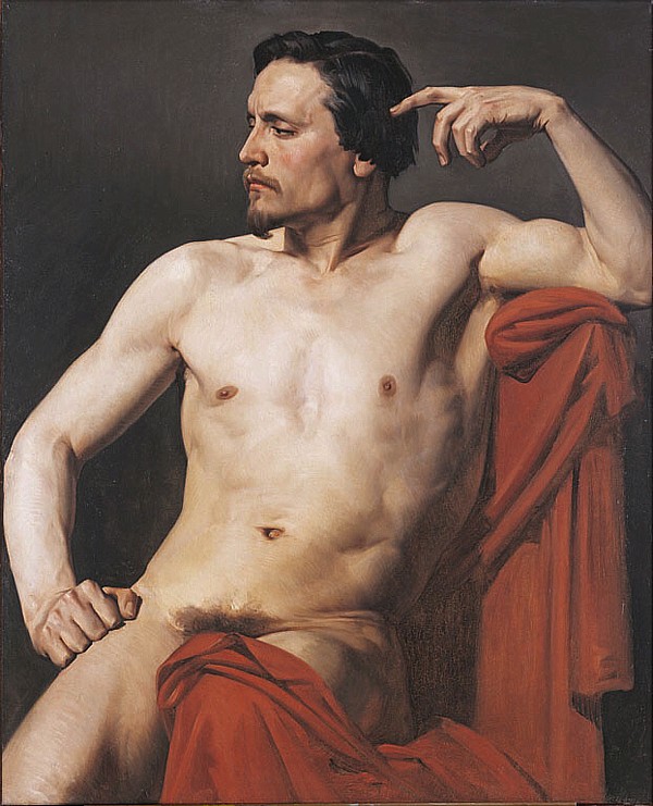 Otra excelente creación conservada en la École nationale supérieure des Beaux-Arts (ENSBA, París), con la que Bouguereau participó en un concurso de figuras de medio cuerpo celebrado en Roma, en el año 1850, de ahí que sea también conocida con los títulos de Retrato de medio cuerpo y Torso. Pintada al óleo sobre tela, esta obra mide 99,5 x 81 cm. En ella Bouguereau retrata de forma sutil y magistral a un luchador llamado Meissonier, sentado y semidesnudo, cubiertos solamente sus genitales y el muslo izquierdo con una tela roja que tapa también el asiento, mirando a su derecha y tocándose la cabeza con un dedo. El sujeto, probablemente en la misma sesión, fue pintado por Paul Jacques-Aimé Baudry, pintor amigo y contemporáneo de Bouguereau, que acentuó más el desnudo y representó el asiento sin el paño. En la pintura de Bouguereau el drapeado de la tela y la iluminación de la fornida anatomía recuerdan a los personajes que aparecen en Dante y Virgilio en el infierno, tanto los dos protagonistas que le dan título, como los dos que figuran luchando en primer plano, el alquimista Capocchio y el estafador Schicchi. |